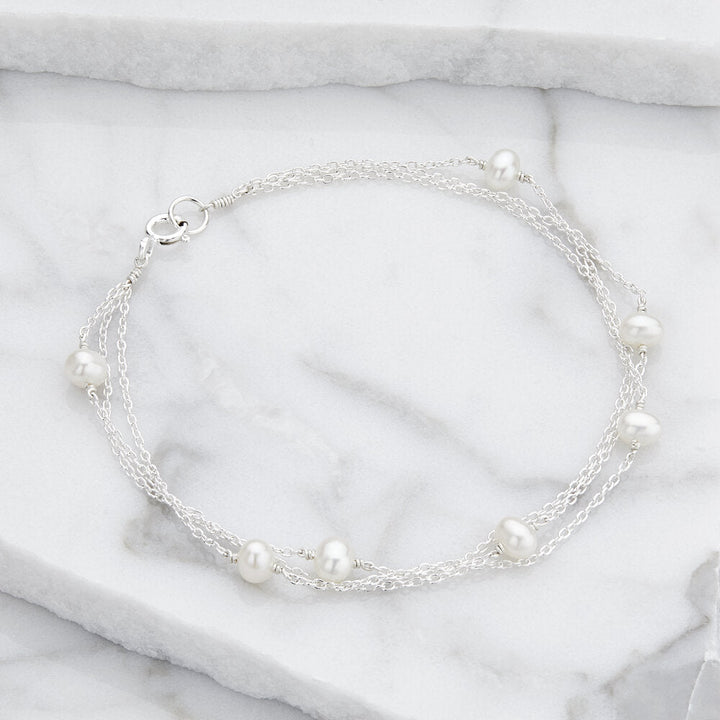 This Silver Layered Pearl Bracelet by Lily & Roo is a stunning handmade piece, perfect for brides or bridesmaids to wear on their wedding day. Featuring multiple layers of freshwater pearls, this bracelet adds a touch of timeless elegance to any outfit. Its versatility makes it a perfect complement to both formal and casual looks.