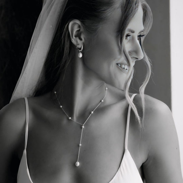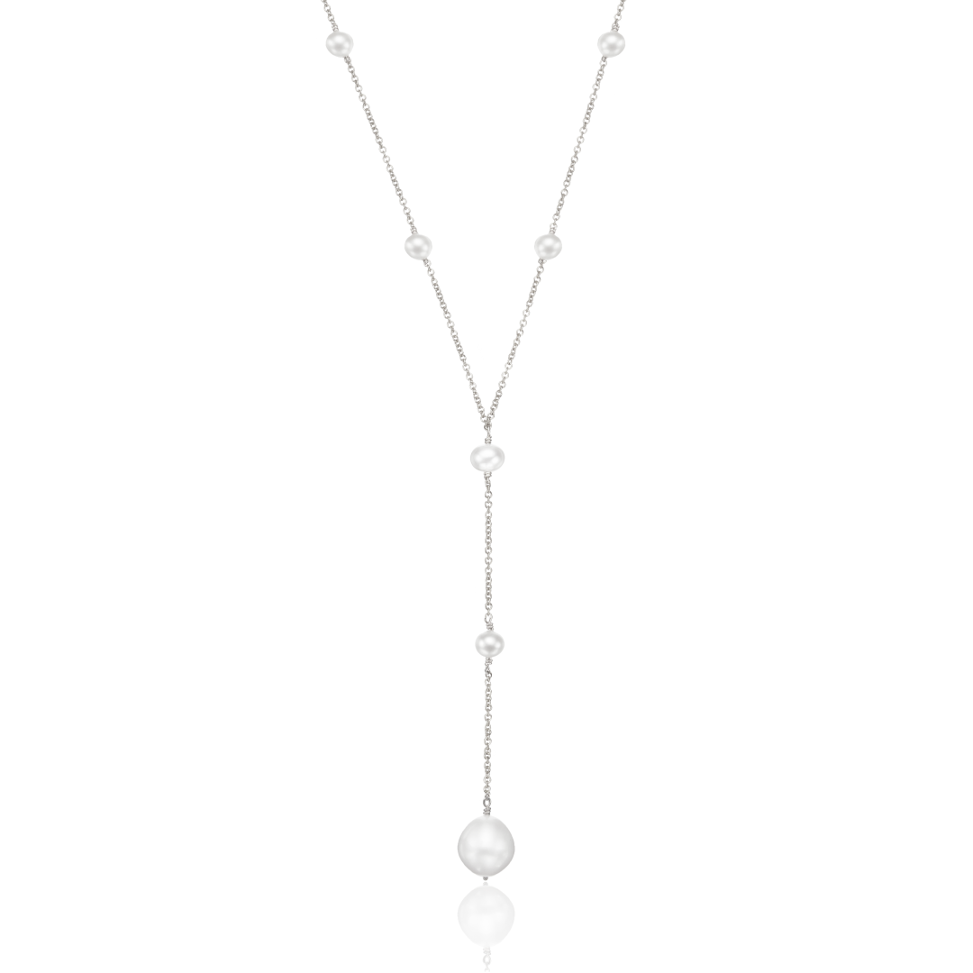 This Silver Multi Pearl Lariat Necklace by Lily & Roo is an elegant and modern piece, handcrafted in our London studio. Made with 10 small freshwater pearls, it is completed with a large freshwater pearl to add a final touch of sophistication. Perfect for brides or bridesmaids, this necklace combines beauty and elegance, making it an ideal accessory for weddings or special occasions. Its versatility allows it to complement any outfit, from casual to formal.