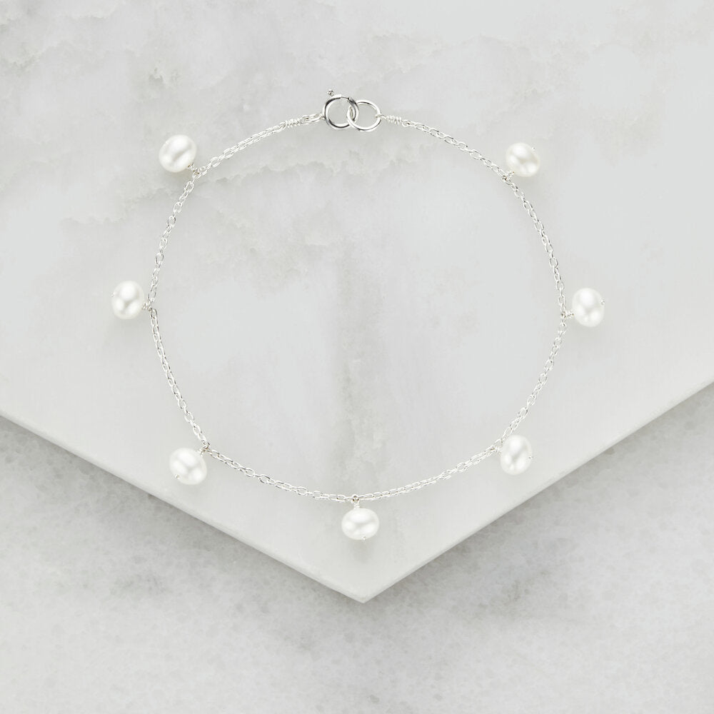 This Silver Pearl Drop Bracelet by Lily & Roo is a beautiful, show-stopping addition to any outfit. Featuring delicate freshwater pearls, this bracelet is the perfect accessory for weddings, adding elegance and sophistication to any bride or bridesmaid ensemble. Handcrafted in our London studio, this bracelet is made with genuine freshwater pearls, ensuring it is both ethically sourced and produced. The simplicity and elegance of this design make it a timeless piece to cherish.