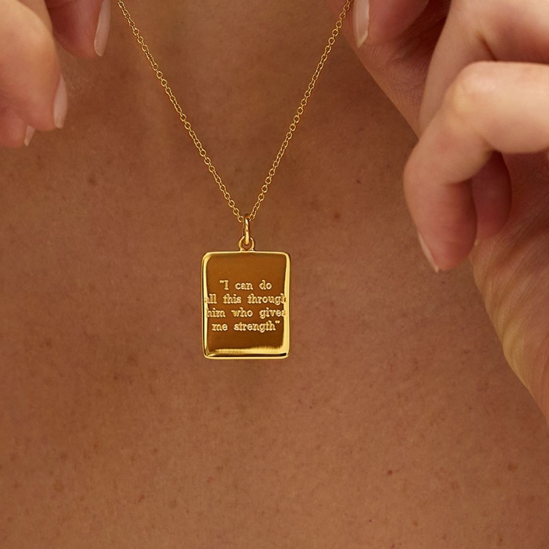 This Silver Personalised Verse Necklace by Lily & Roo is a beautifully crafted piece that allows for a unique and personal engraving. Whether it's a meaningful phrase, name, or date, this necklace gives you the opportunity to wear something deeply personal and special. Crafted from 925 sterling silver and plated in 14ct gold, this piece adds a sentimental touch to your daily style.