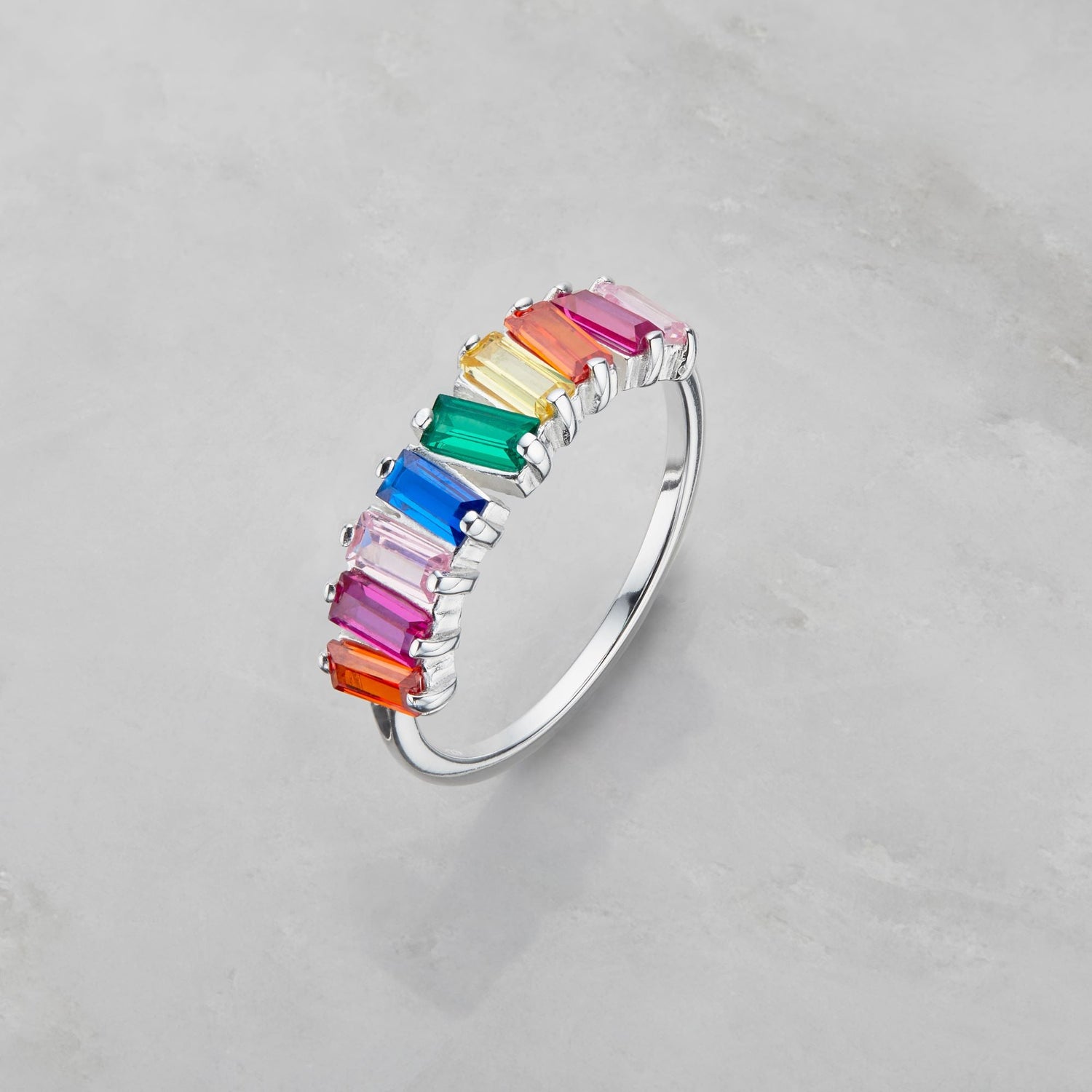This Silver Rainbow Gemstone Cluster Ring by Lily & Roo features a row of nine vibrant gemstones, creating the perfect amount of sparkle. This ring is available in three sizes and can be worn alone for a subtle pop of color or paired with the matching rainbow huggie hoop earrings and bracelet for a coordinated look. A perfect gift for any lady, this ring adds a fun and colorful touch to any jewelry collection.