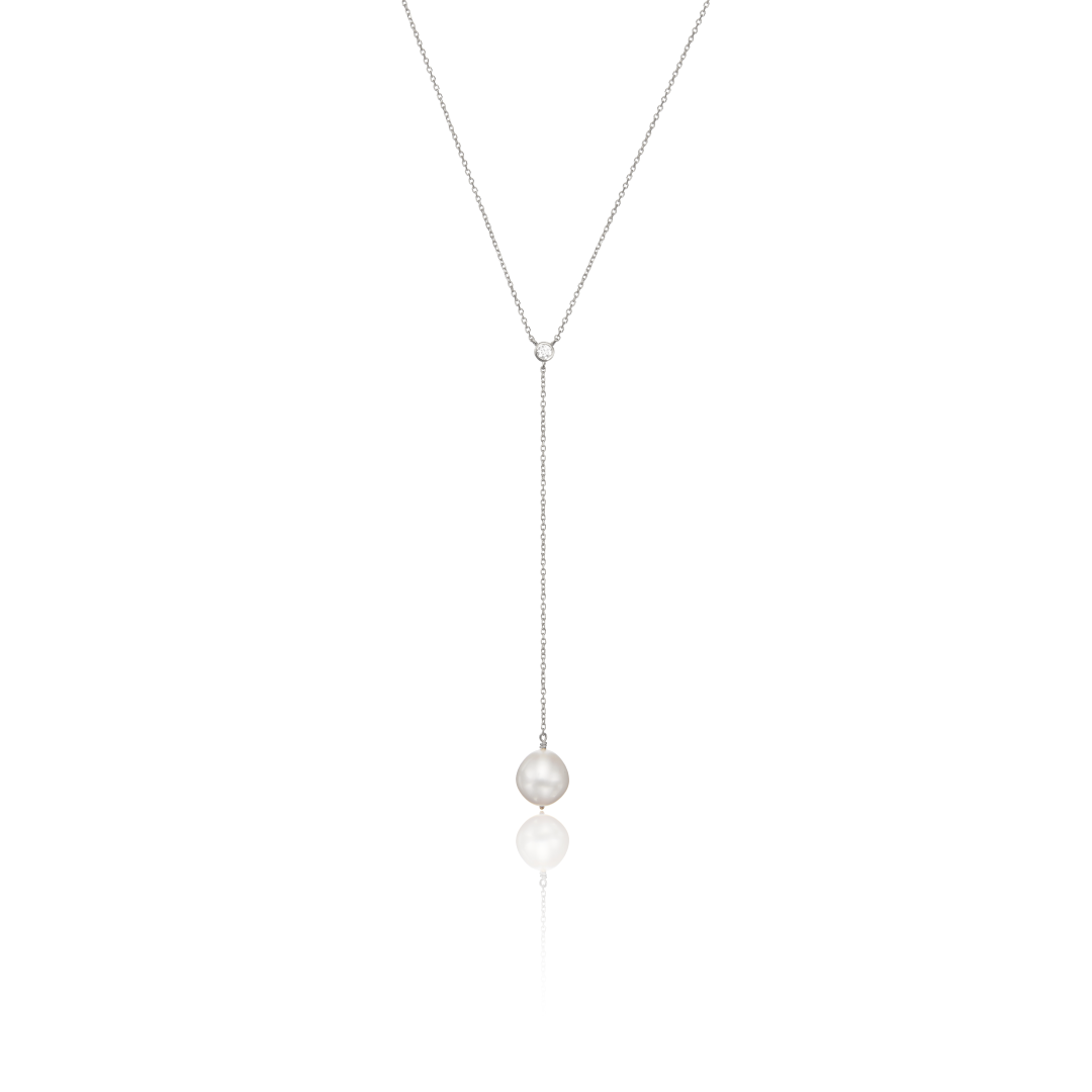 This Silver Single Diamond Style Pearl Lariat Necklace by Lily & Roo is an elegant piece, perfect for brides or bridesmaids. The large freshwater pearl and pavé set crystal move delicately, creating a subtle shimmer with every movement. Its lariat design adds a modern touch to the classic bridal look.
