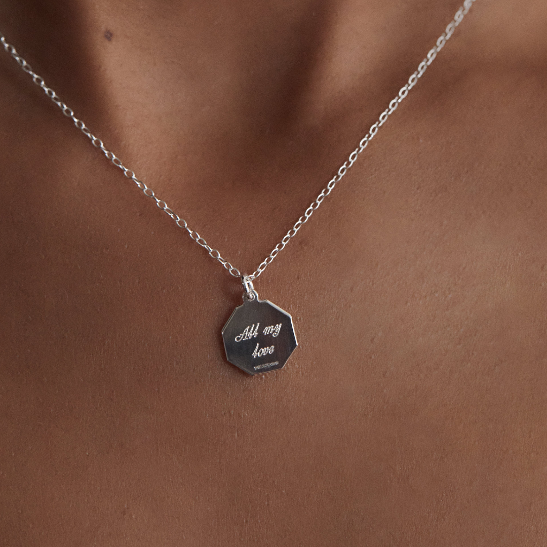 This Silver Small Octagonal St Christopher Necklace by Lily & Roo is a dainty and meaningful piece, perfect for everyday wear. The small octagonal pendant features St. Christopher, the patron saint of travelers, offering protection to anyone who wears it. This necklace is an ideal gift for someone embarking on a journey or simply as a symbol of love and care. Personalize it with an engraving of up to 15 characters on the reverse to make it extra special.