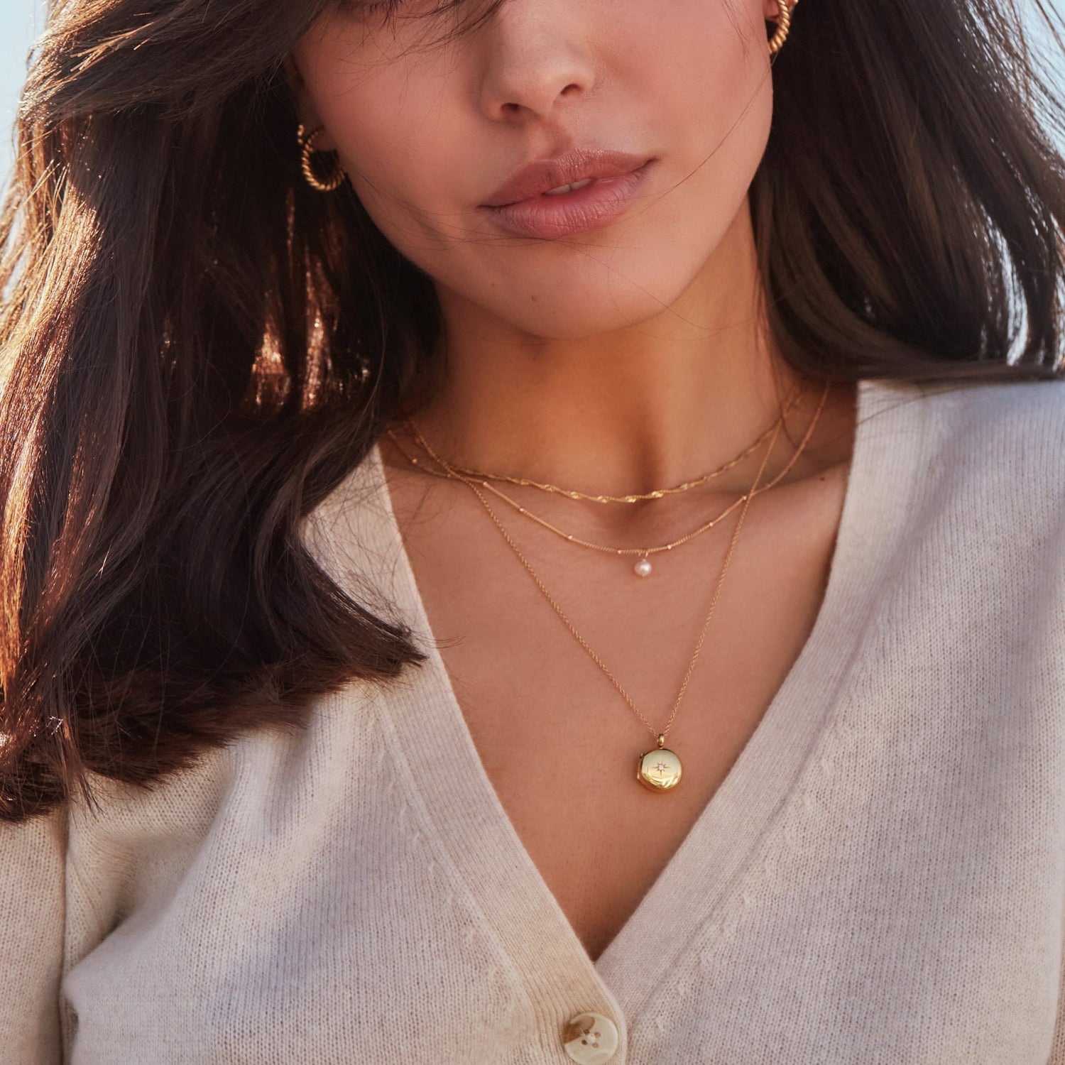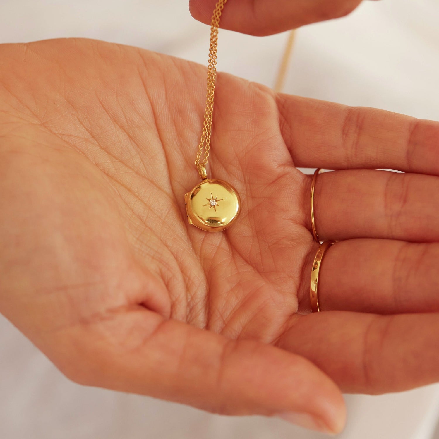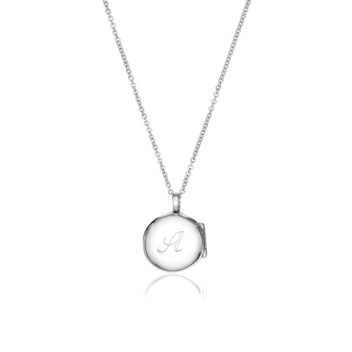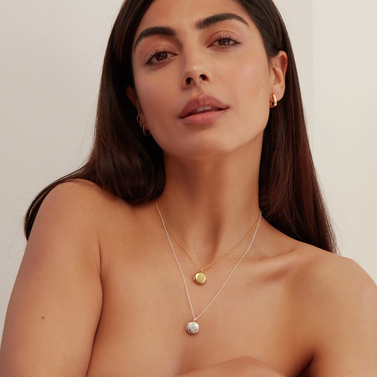This Silver Small Round Diamond Locket Necklace by Lily & Roo is an elegant and sentimental piece. The locket features a stunning white diamond set in the front, and can be engraved with an initial on the back. Inside, it holds space for two 11mm diameter photographs of loved ones, making it a beautiful way to keep cherished memories close to your heart.