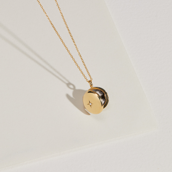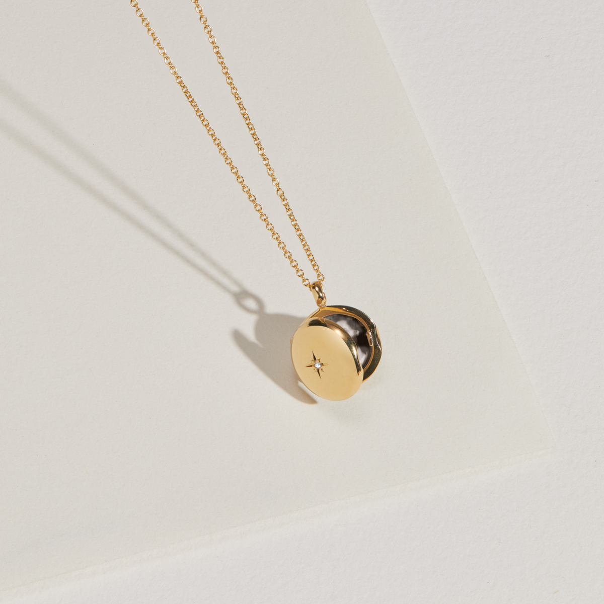Made of solid sterling silver 925, featuring a white diamond set in the front, and space for two photographs inside. Engraving available for 1 character.