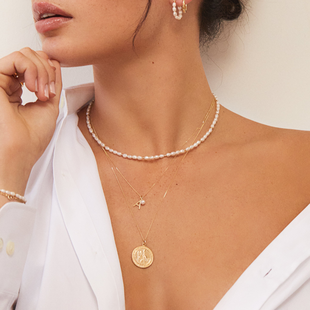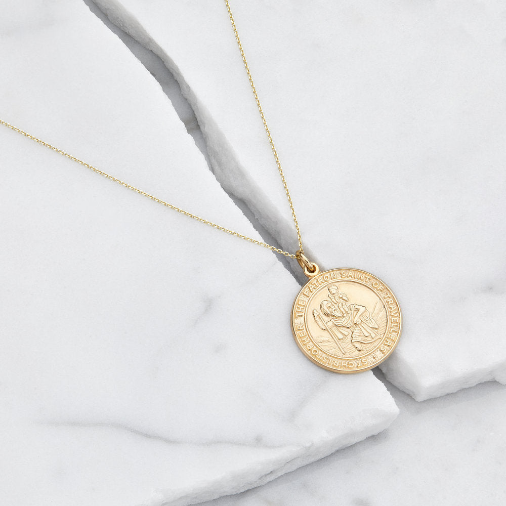 This Solid Gold Large Round St Christopher Medallion Necklace by Lily & Roo is a timeless piece, designed for everyday wear and perfect for layering. The round medallion pendant features the iconic St. Christopher, symbolizing protection for travelers. Personalized with an engraving, this necklace becomes an even more special keepsake. The medallion adds elegance to any outfit, making it a great gift for significant milestones.