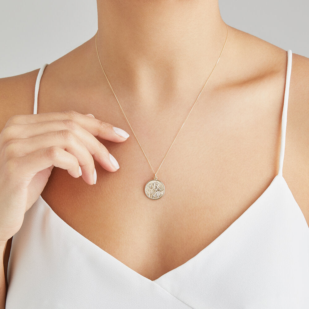 This Solid Gold Medium Round St Christopher Necklace by Lily & Roo is a beautiful and meaningful piece, perfect for everyday wear and layering. The round pendant features St. Christopher, the patron saint of travelers, offering protection to anyone who wears it. Personalize it with an engraving of up to twenty characters on the reverse for a thoughtful, unique gift.
