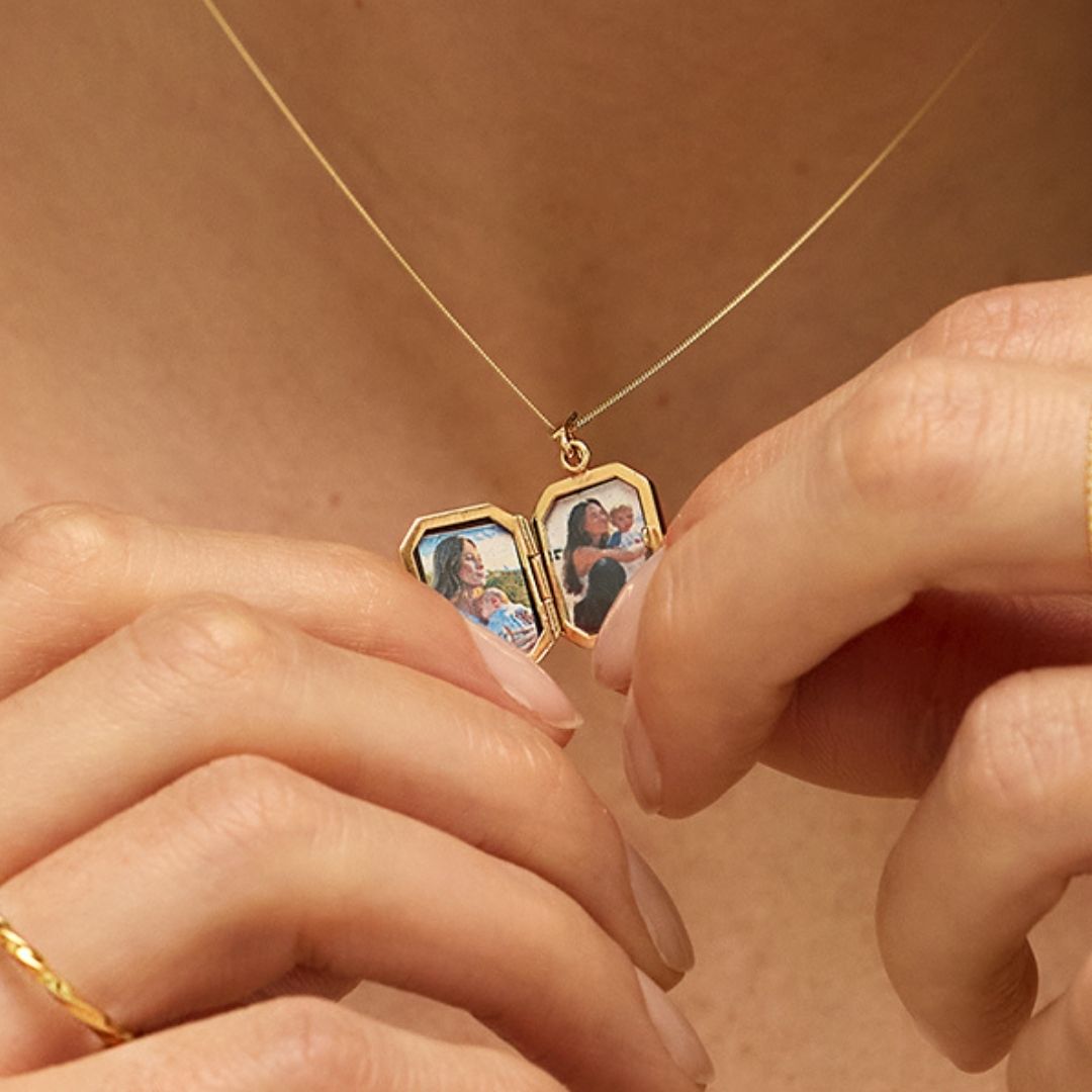 Available in solid sterling silver and solid 9ct gold. Features a small square locket that holds two photographs. Engraving available.