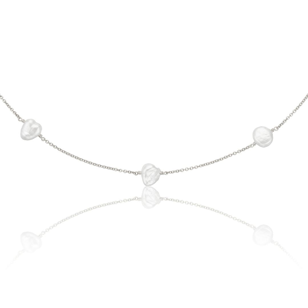 Solid 9K white gold, featuring five baroque freshwater pearls. Also available in 925 sterling silver, 14K gold-filled, 14K rose gold-filled, and solid 9K gold.