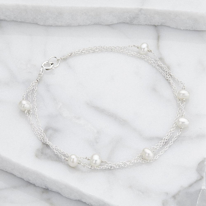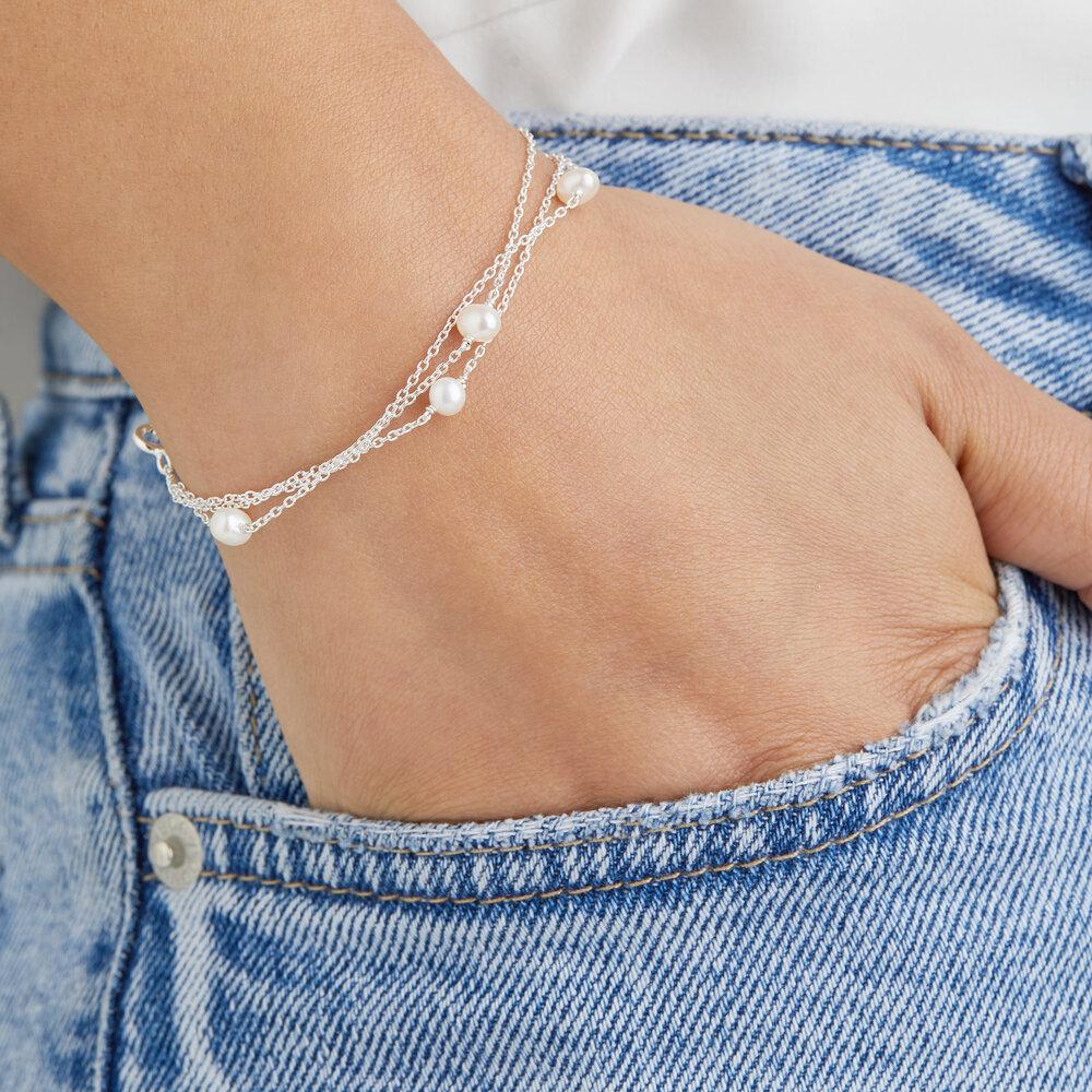 This Solid White Gold Layered Pearl Bracelet by Lily & Roo is a timeless and elegant jewelry piece, perfect for a bride or bridesmaid. Handmade with love in our London studio, it features beautiful freshwater pearls, each carefully handpicked for its unique luster and shape. This bracelet complements any outfit, from a wedding dress to everyday attire, making it a versatile and thoughtful gift.