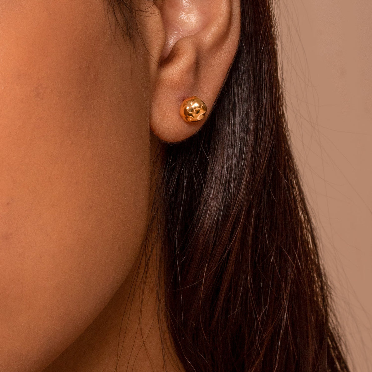 Available in sterling silver or 18ct yellow gold vermeil on sterling silver. Featuring a 7mm nugget design with an irregular organic finish. Finished with a post and butterfly fastening.