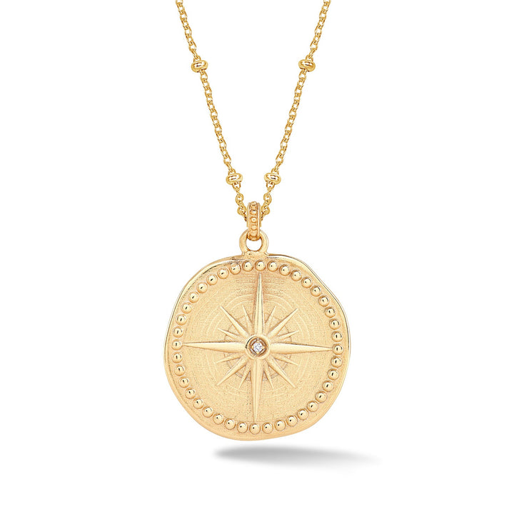 This Diamond True North Talisman Necklace by Dower & Hall is a perfect piece for guiding your journey. Featuring a large true north compass charm set with a sparkling white 1pt diamond, this necklace is suspended on a dotty bead slider chain. Personalize the charm with engraving, such as names, dates, or coordinates of a special place.