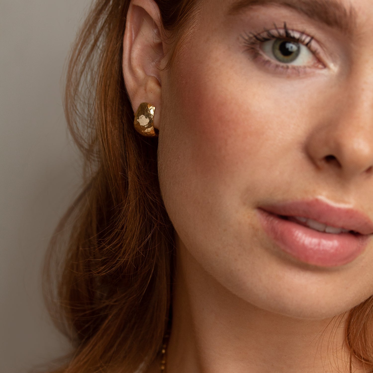 Available in sterling silver or 18ct yellow gold vermeil. Featuring a chunky tapering half hoop design with a hammered finish. Measures approximately 18 x 13mm. Finished with post and butterfly back.