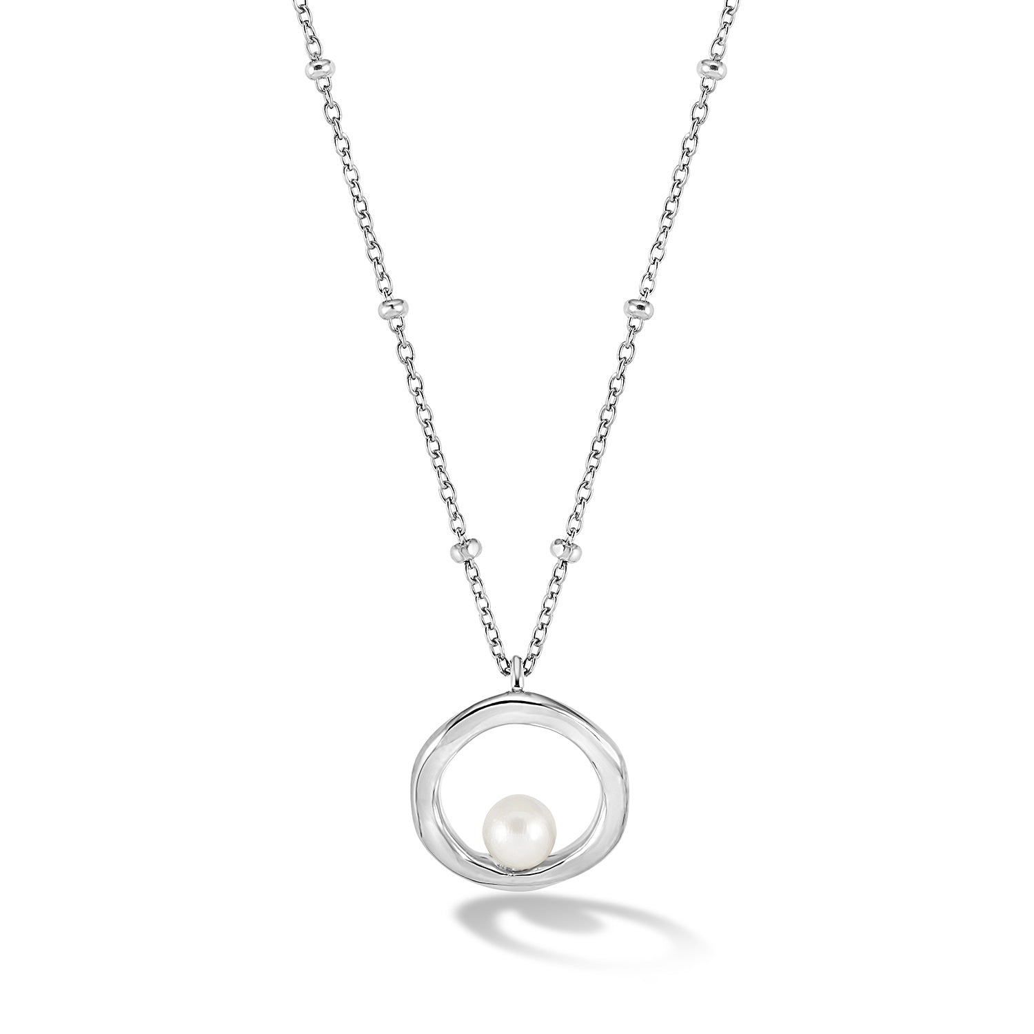 This Open Circle & White Pearl Waterfall Pendant by Dower & Hall is handcrafted in our London studio. This modern open circle pendant features an organic ripple pattern and is accented with a single white freshwater pearl. The pendant is suspended on a beaded slider chain, enabling the wearer to adjust the length as desired. Available in both yellow gold vermeil and sterling silver finishes, it offers a timeless elegance to any ensemble.
