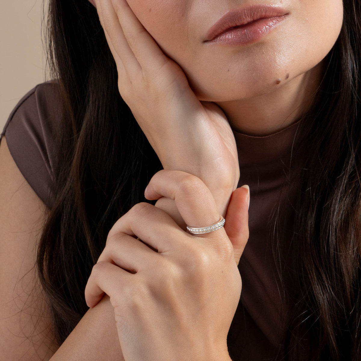 This Granular Dotty Twinkle Ring by Dower & Hall features a unique raised dot texture around the entire band, adding dimension and a playful touch to the design. Perfect for daily wear, this sterling silver ring looks stunning worn alone or stacked with other Twinkle rings, making it an essential piece for any collection.