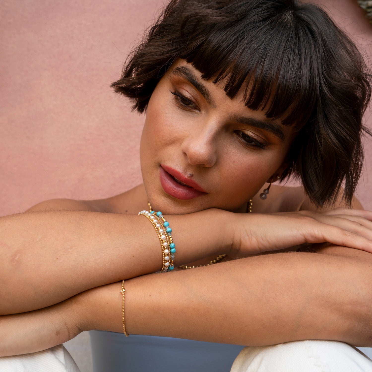 Crafted in sterling silver with 18ct yellow gold vermeil finish, featuring 3-4mm white freshwater pearls. Adjustable between 7-8 inches.