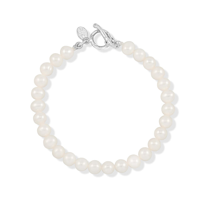 Handcrafted in sterling silver with 6mm white cultured freshwater pearls. Finished with a sterling silver beaten loop and t-bar catch. Available in sizes S (7.25 inches), M (7.50 inches), and L (8 inches).
