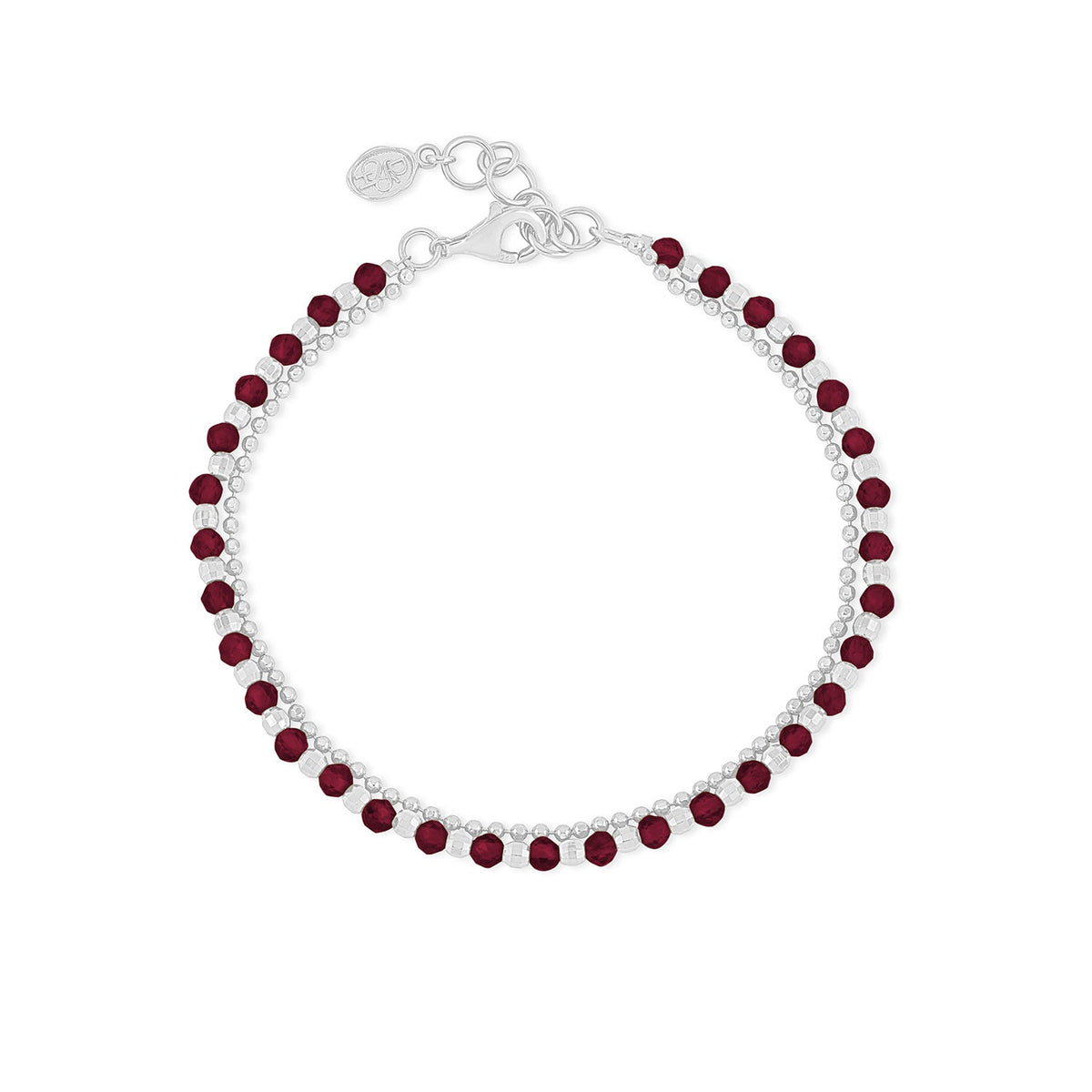 This Garnet Faceted Bead Orissa Bracelet by Dower & Hall features rich, deep red garnet beads that capture the light beautifully. The bracelet’s faceted 3-4mm garnet gemstones are complemented by sparkling sterling silver beads, creating a striking contrast.