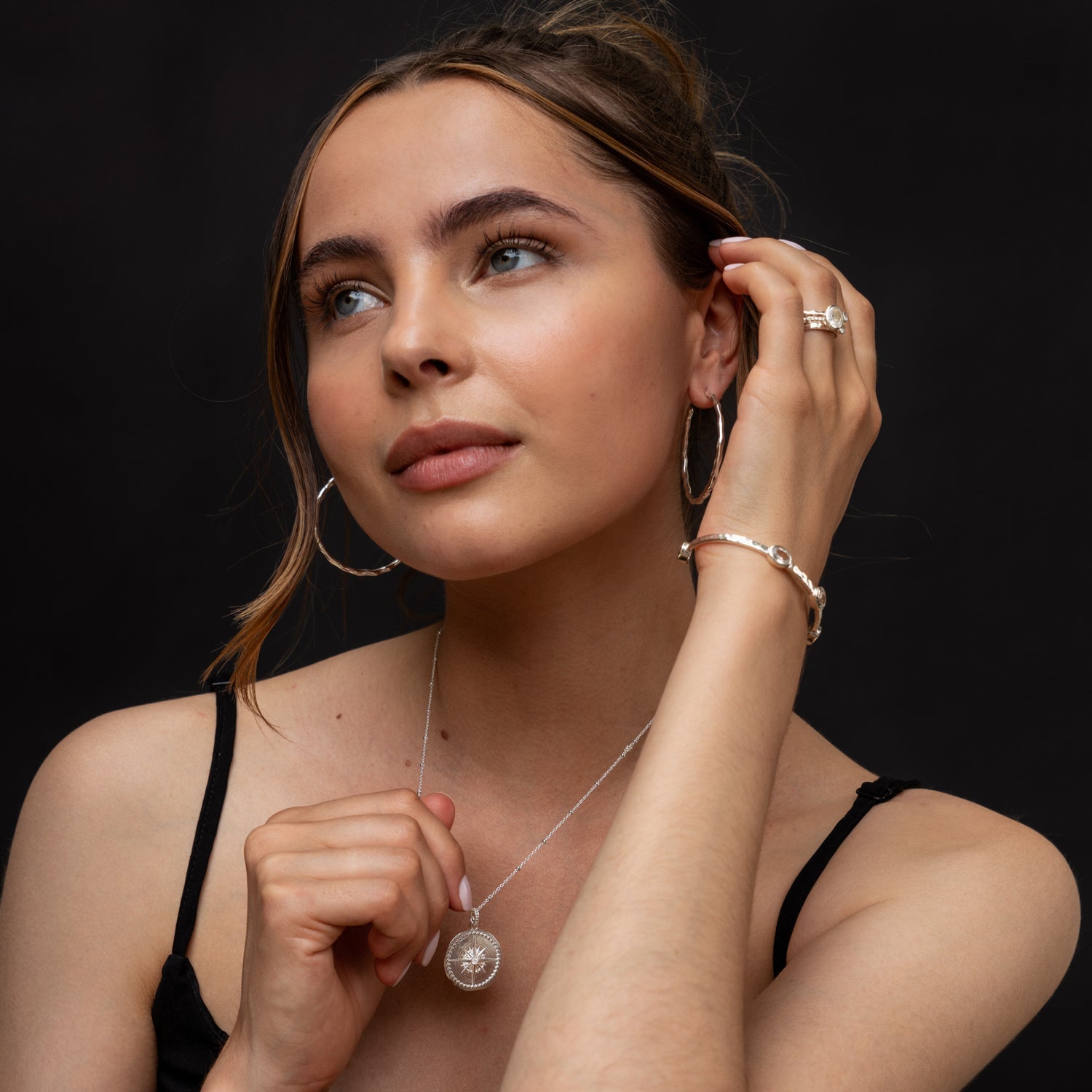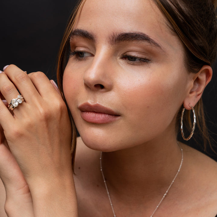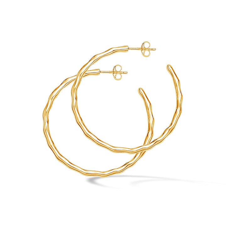 These Large Waterfall Hoops by Dower & Hall feature an organic ripple pattern, creating a subtle yet striking design. Made from sterling silver, these earrings are finished with a post and butterfly back for secure wear. Available in either sterling silver or with a luxurious 18ct yellow gold vermeil finish, these hoops are perfect for everyday wear. Size - 44mm.