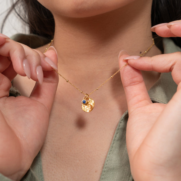 Handcrafted in sterling silver with blue sapphire (3mm) and hammered discs (13mm). Adjustable dotty bead slider chain with signature quatrefoil lobster catch. Available in sterling silver or 18ct yellow gold vermeil finish.