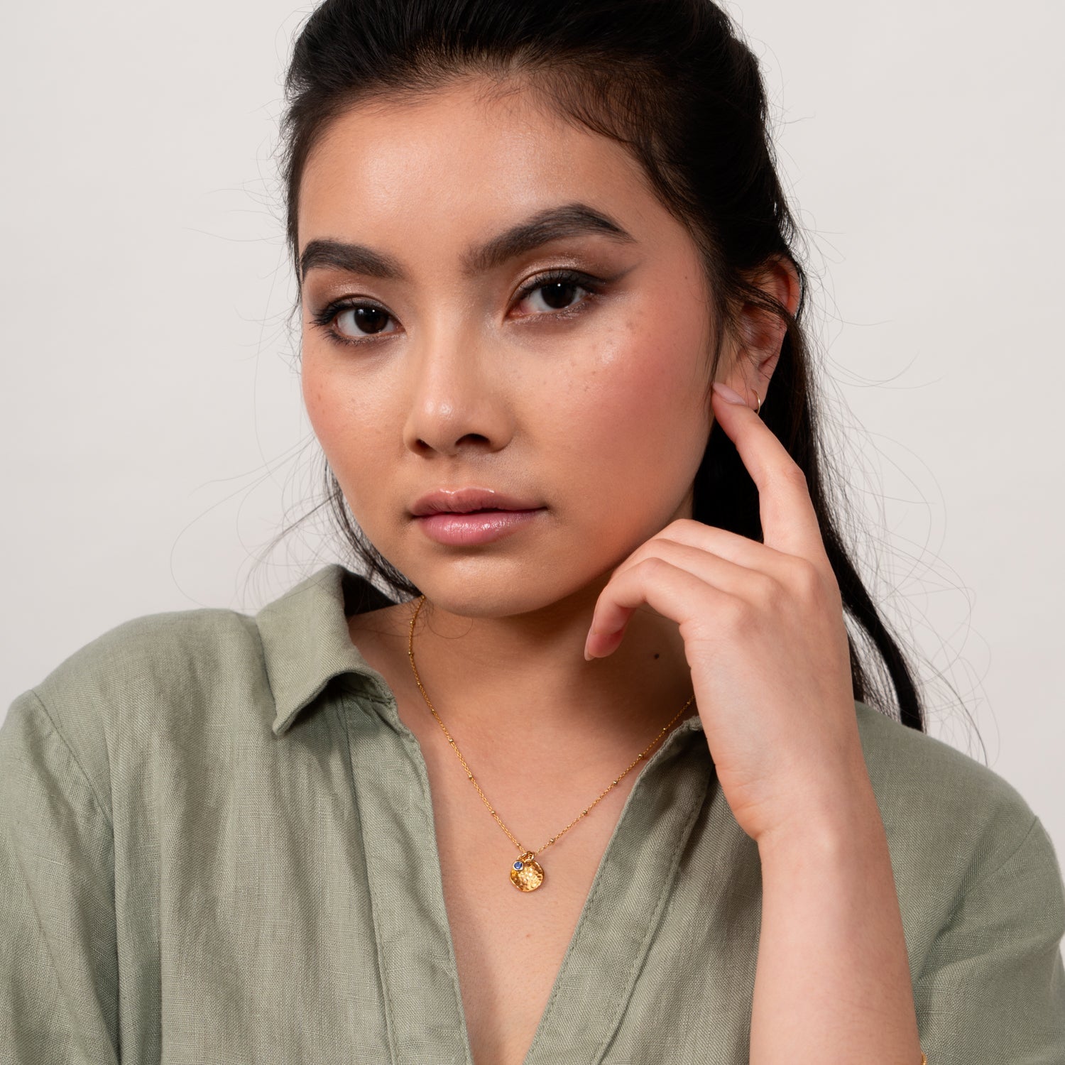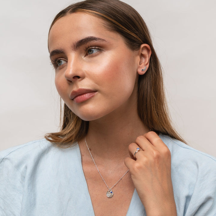 This Hammered Disc & Blue Sapphire Array Necklace by Dower & Hall features a handcrafted hammered disc with a stunning blue sapphire gemstone pendant. Suspended on an adjustable dotty bead slider chain, this necklace offers a modern yet elegant design. The perfect balance of sophistication and contemporary style.
