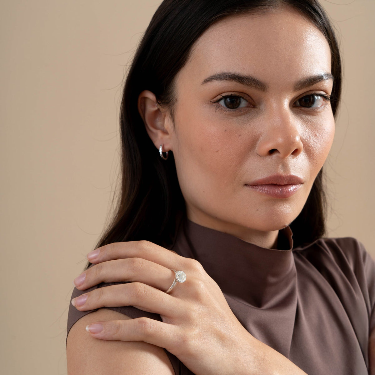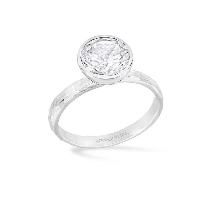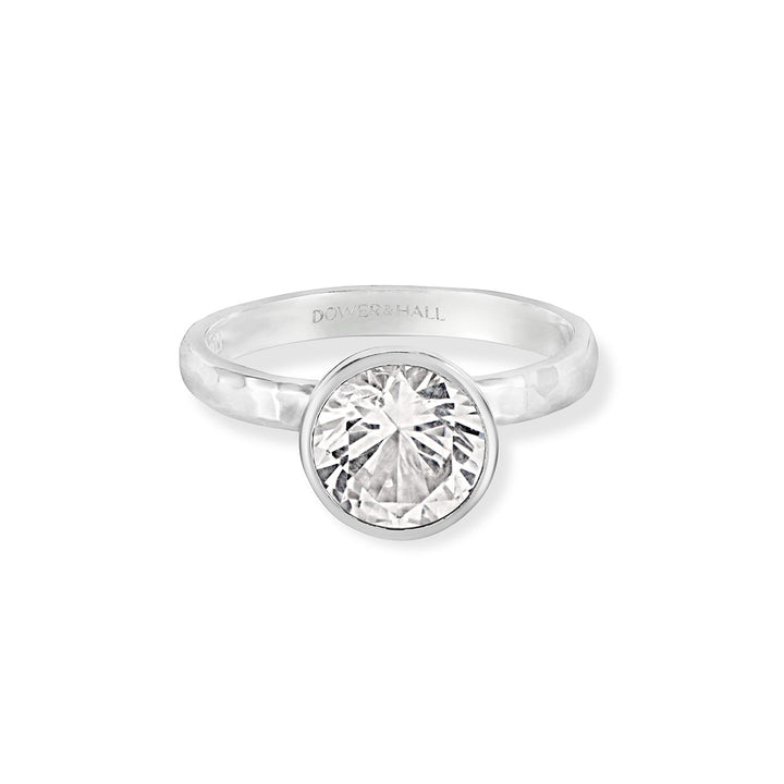 This 8mm White Topaz Hammered Twinkle Ring by Dower & Hall features a 8mm faceted round white topaz set on a band with the signature hammered finish. Ideal for adding a pop of sparkle, this stackable sterling silver ring can be worn alone or stacked with other Twinkle rings. Available in sizes J-S, with custom sizes available on request.