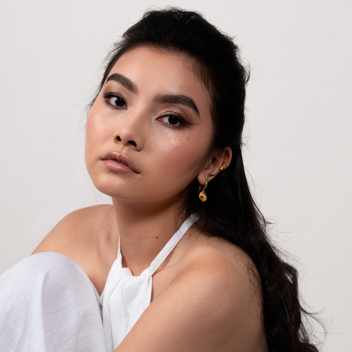 These Hammered Disc & White Topaz Array Drop Earrings by Dower & Hall combine the brilliance of white topaz with the textured elegance of hammered discs. The light-catching gemstones are suspended on contemporary ear wires, making these earrings perfect for both everyday wear and special occasions.