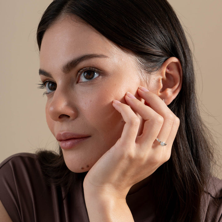 Handmade in sterling silver. Featuring a 4mm round faceted white topaz set on a hammered finish band. Width - 2-2.5mm. Available in sizes J-S.