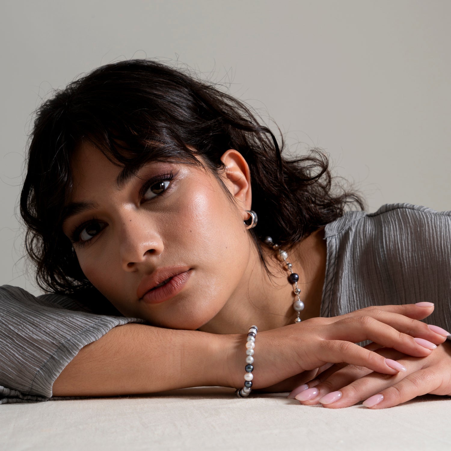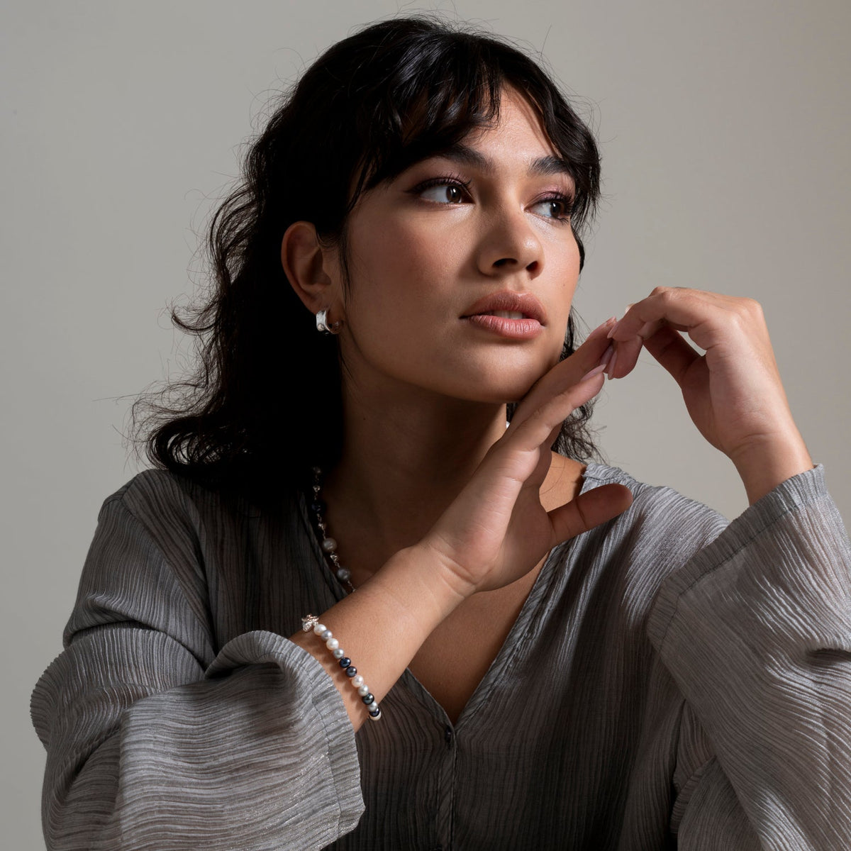 This Timeless Mixed Freshwater Pearl Bracelet by Dower & Hall is a classic and elegant piece that features 6mm mixed white, dove grey, and peacock cultured freshwater pearls. The bracelet is finished with the brand’s signature sterling silver beaten loop and t-bar catch, making it an essential for any jewelry collection. Its understated elegance makes it perfect for both day and night wear.