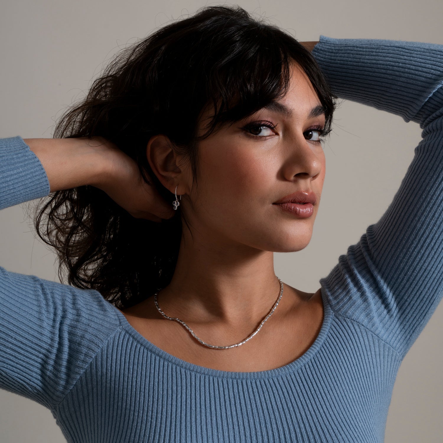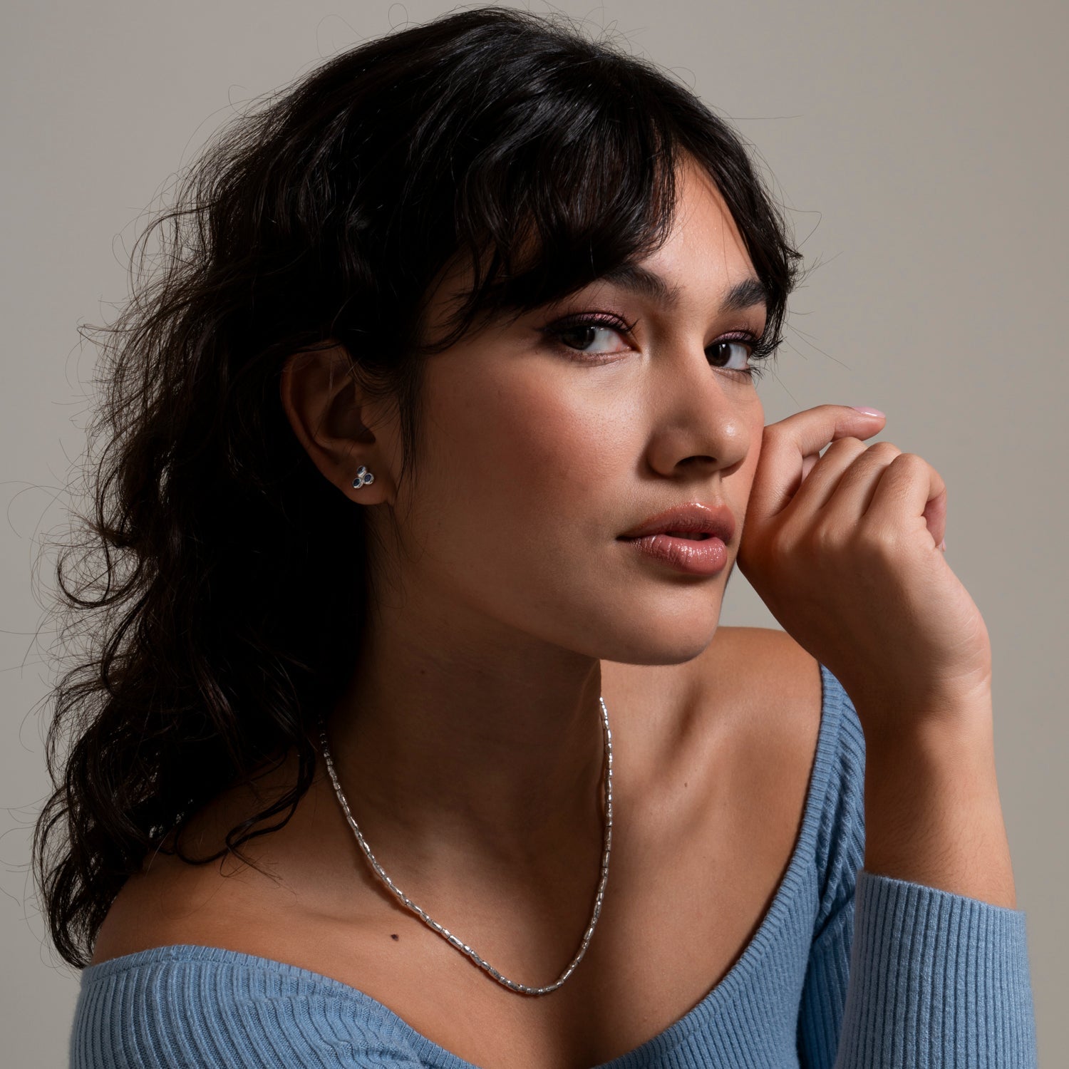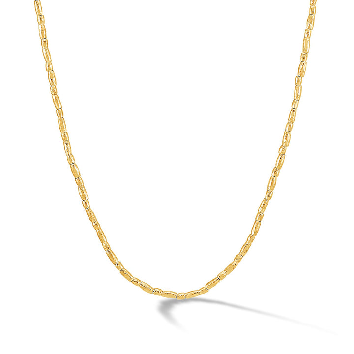 Handcrafted in sterling silver with caraway 'rice' cylinder beads, finished with a hammered loop and t-bar clasp. Available in yellow gold vermeil on sterling silver.