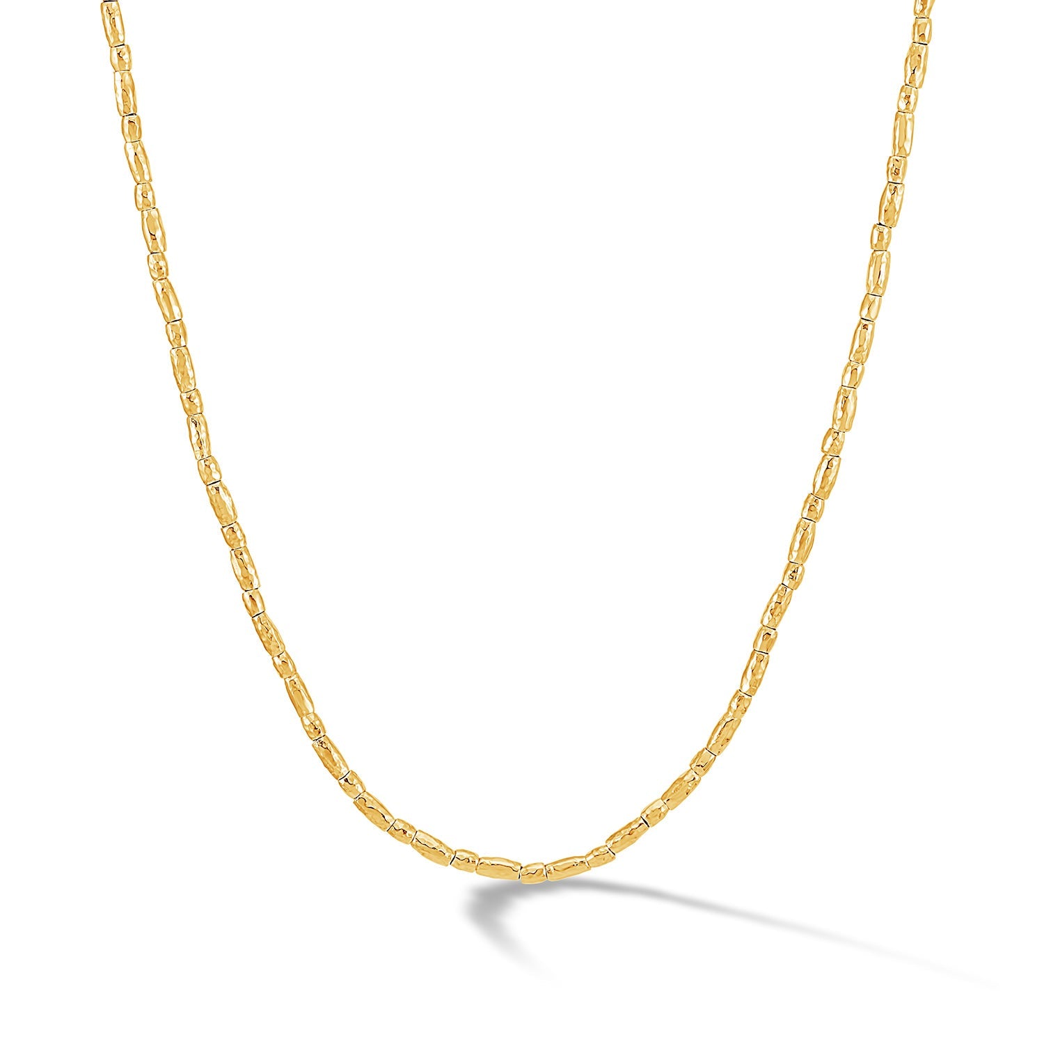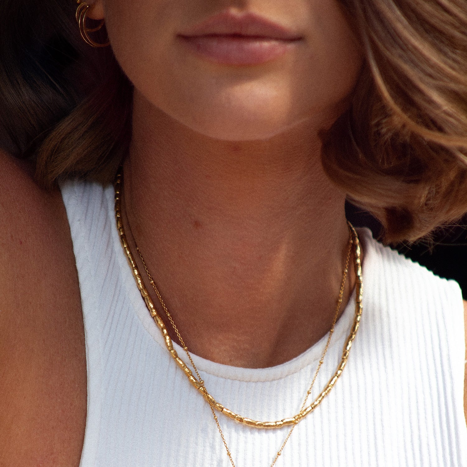This Rice Nomad Necklace by Dower & Hall is a stunning piece made from caraway 'rice' cylinder beads threaded onto a sterling silver chain. The necklace is finished with a signature hammered loop and t-bar clasp, showcasing the brand’s attention to detail. Available in a radiant yellow gold vermeil finish, this necklace is perfect for those looking for a modern, sophisticated piece that pairs well with both casual and formal outfits.