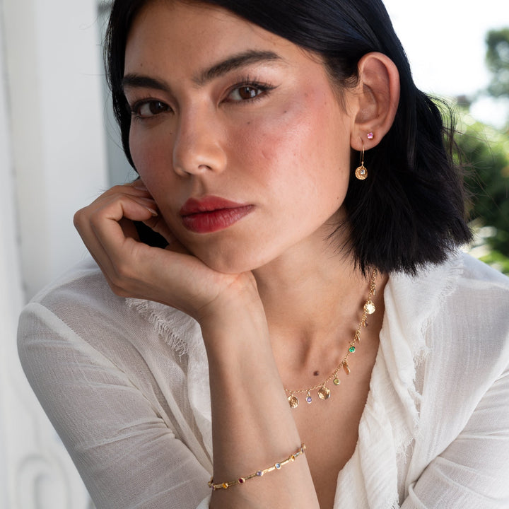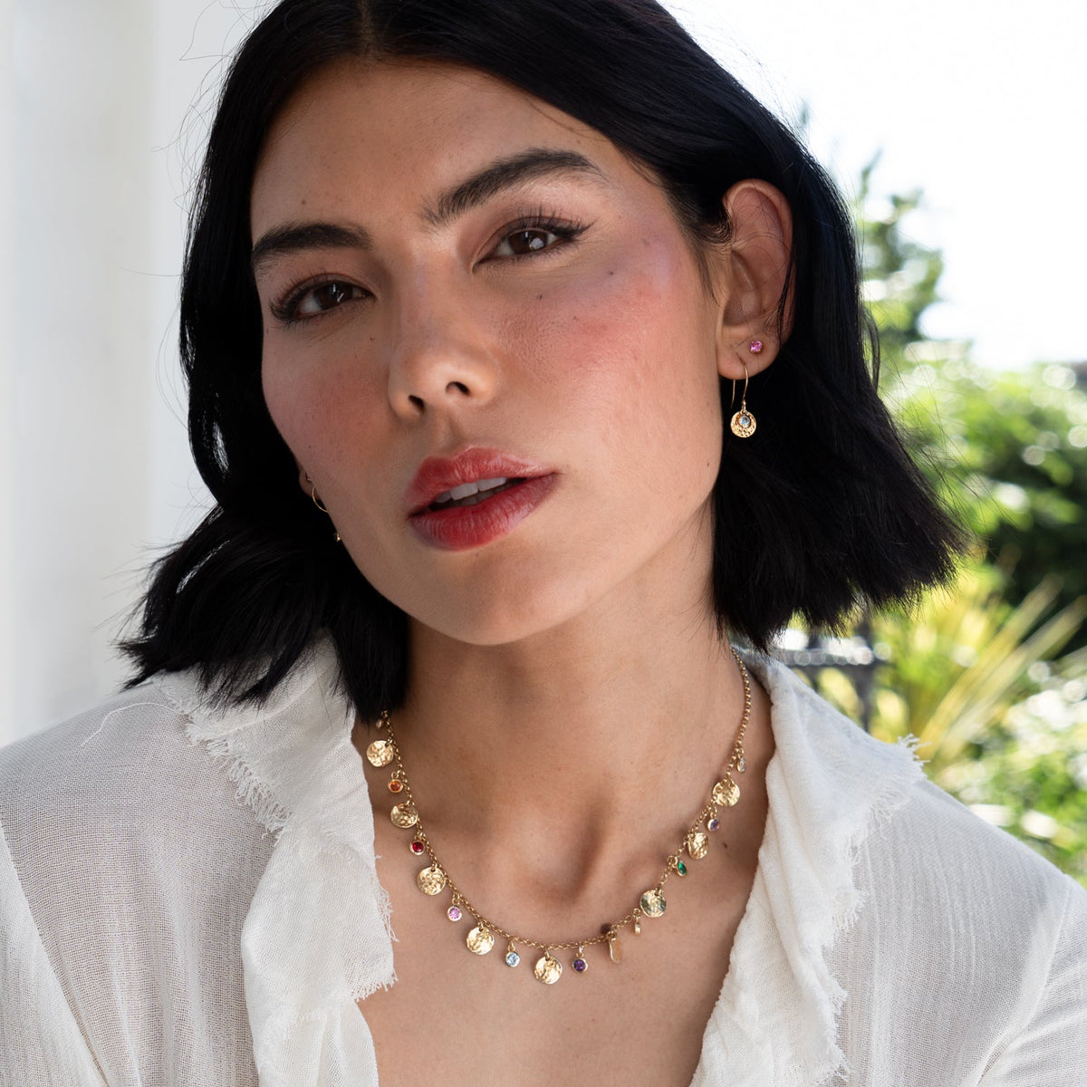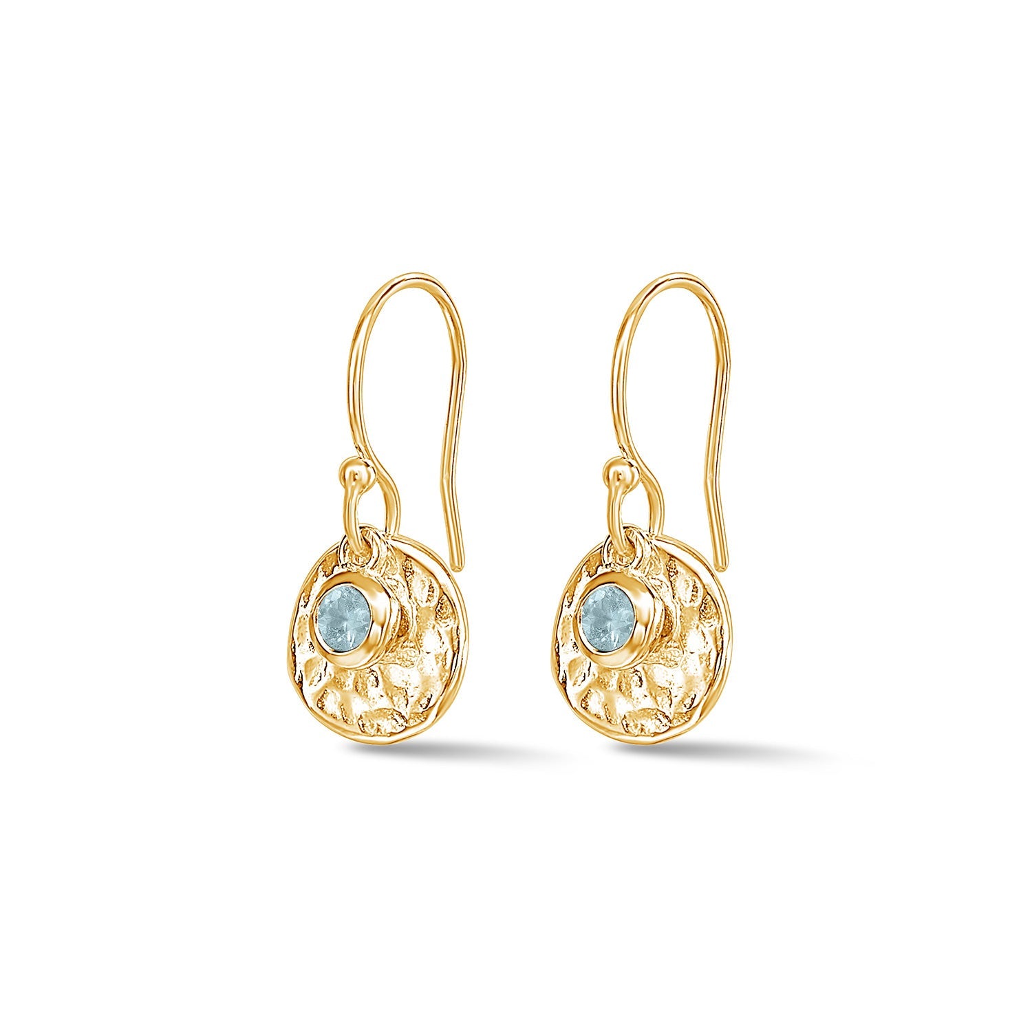 Made from sterling silver with 18ct yellow gold vermeil finish, featuring 3mm aquamarine gemstones. Disc size: 9mm. Total length: 25mm.