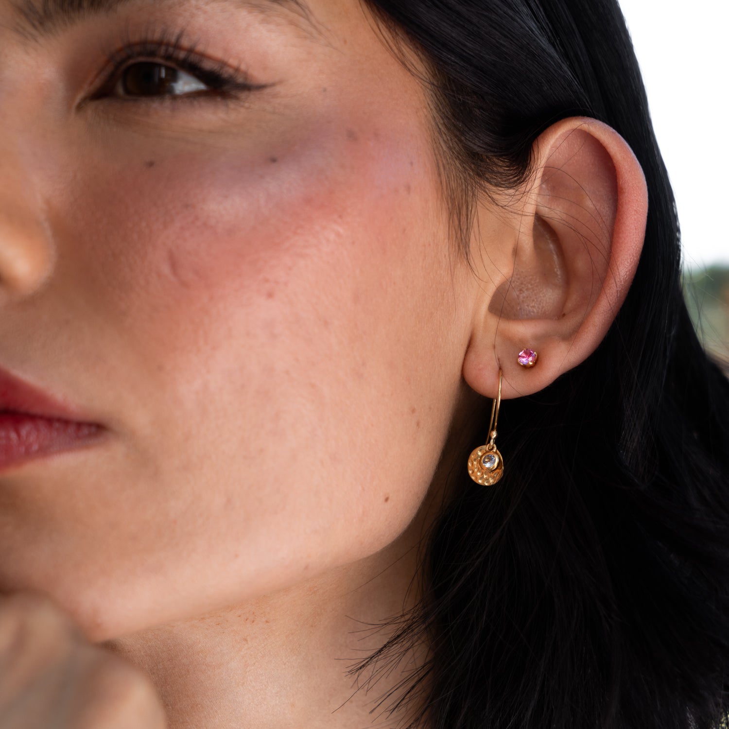 These Hammered Disc & Aquamarine Array Earrings by Dower & Hall feature a handcrafted hammered round disc, layered with a vibrant aquamarine gemstone encased in a round setting. The design is both modern and timeless, with the elements hanging gracefully from signature ear wires, making these earrings perfect for any occasion.
