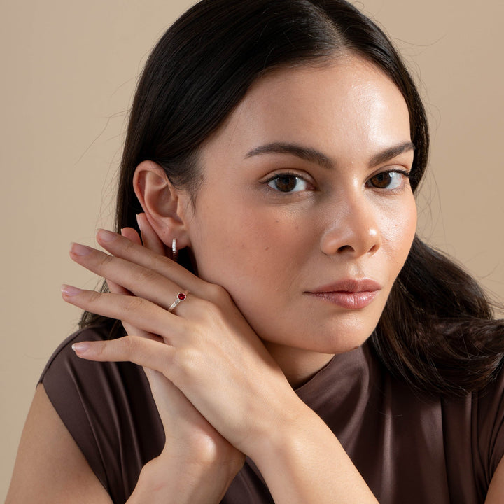 Handcrafted in sterling silver with a 4mm faceted round garnet, measuring 2-2.5mm in width. Available in sizes J-S; other sizes available upon request at an additional cost.