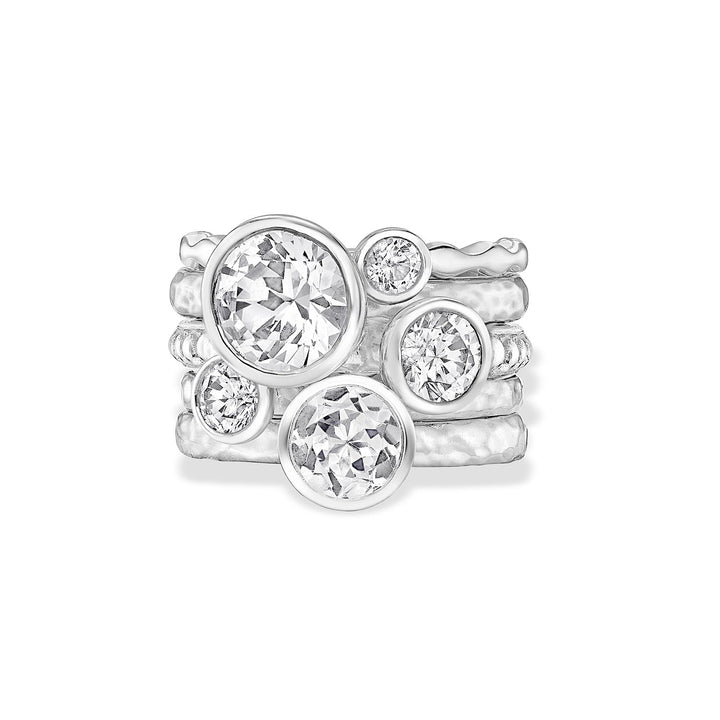 Handmade in sterling silver. Featuring 8mm, 6mm, and 4mm white topaz on hammered and granular dotty bands, finished with a 3mm white sapphire on a wave band.