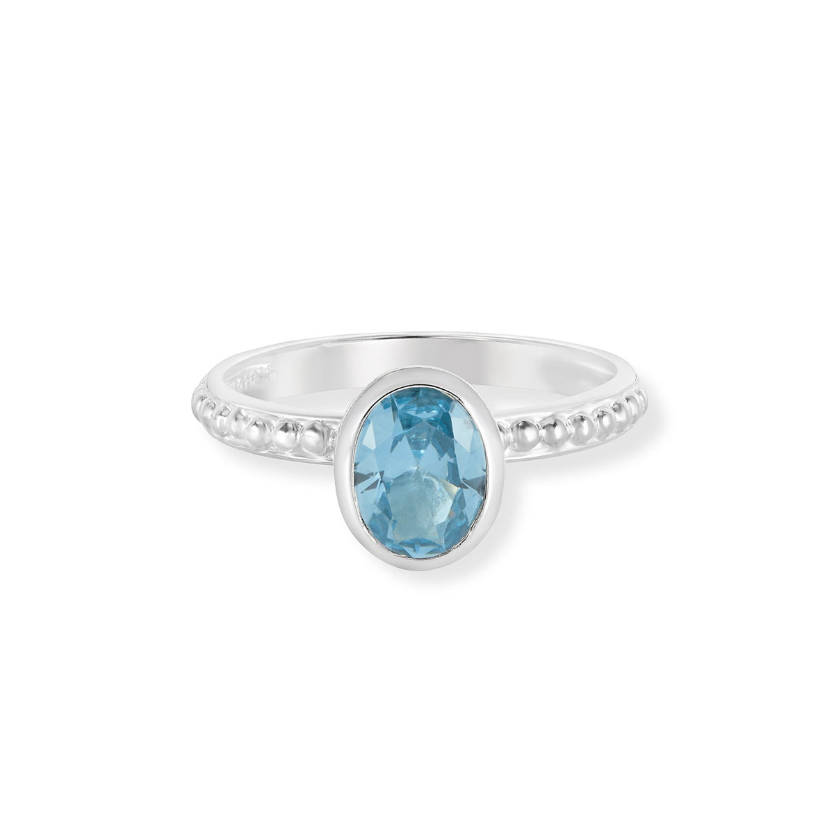 Handmade in sterling silver. Featuring an 8 x 6mm faceted oval blue topaz set on a raised dot textured band. Width - 2.5mm. Available in sizes J-S.