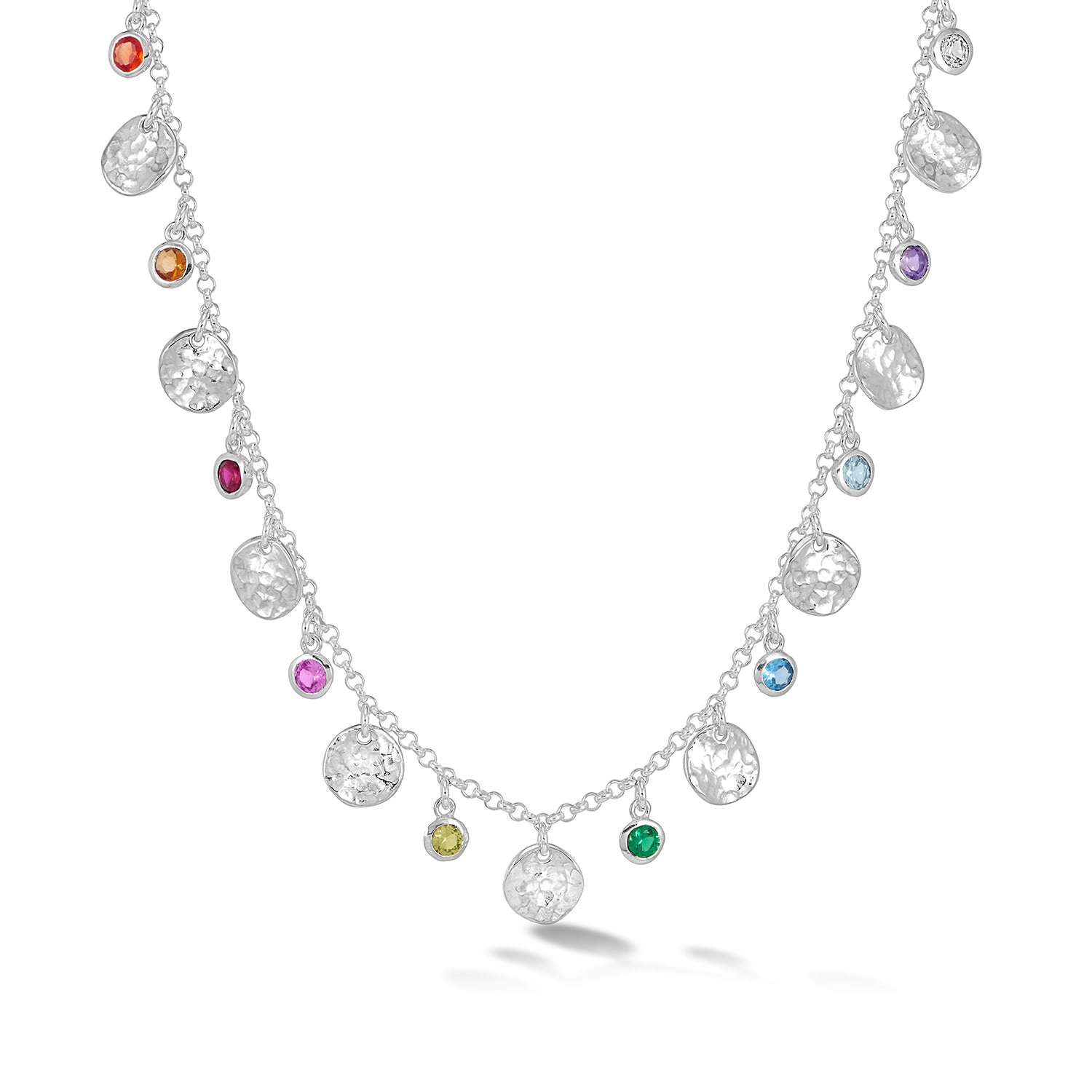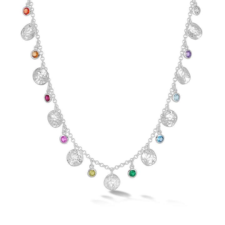 This Hammered Disc & Mixed Gemstone Array Necklace by Dower & Hall combines contemporary hammered discs with a rainbow of colorful gemstones, including amethyst, aquamarine, garnet, peridot, tourmaline, citrine, and white topaz. The twinkling stones are paired with a signature hammered loop and t-bar chain, creating a stunning and modern necklace that shines in the light.