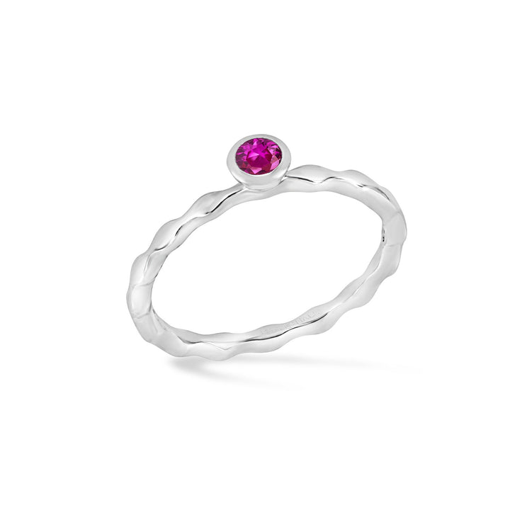 Handcrafted in sterling silver with a 3mm faceted round pink sapphire, measuring 2-2.5mm in width. Available in sizes J-S; other sizes available upon request at an additional cost.