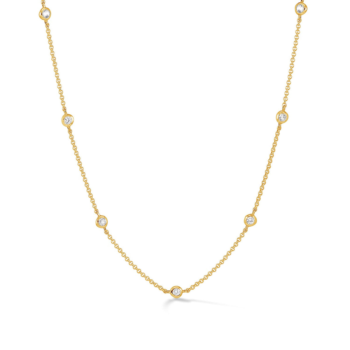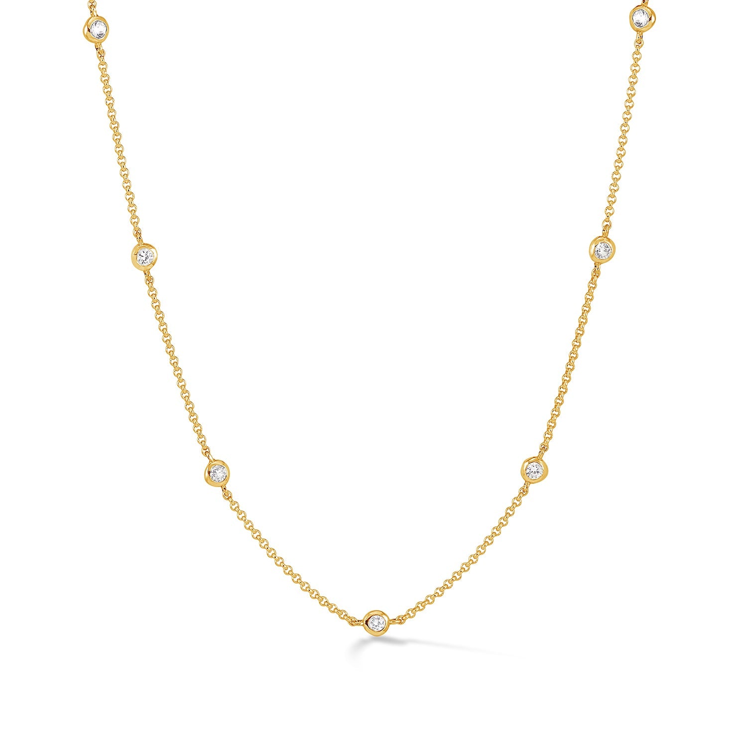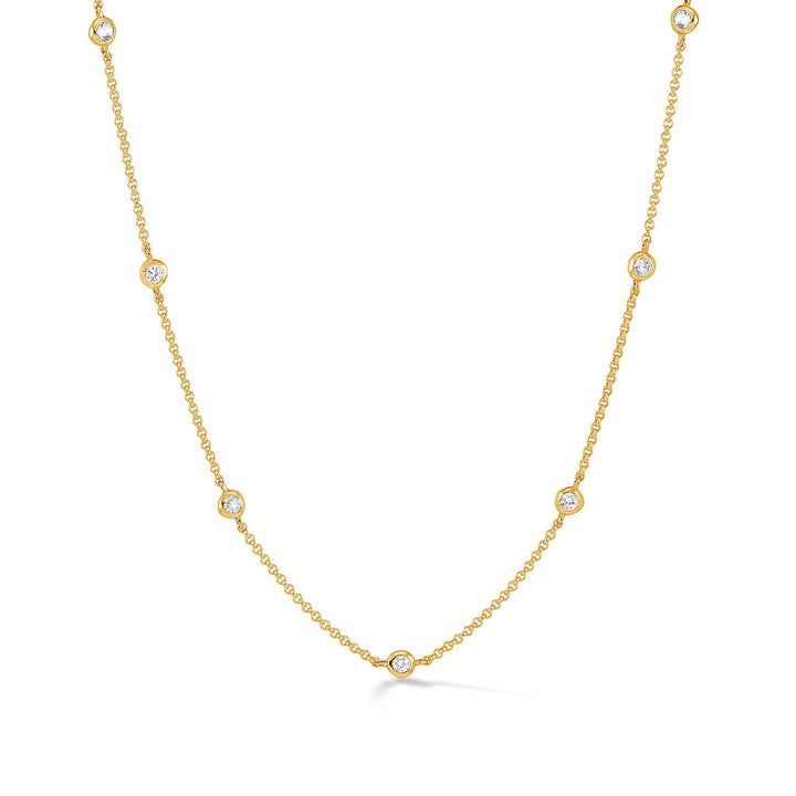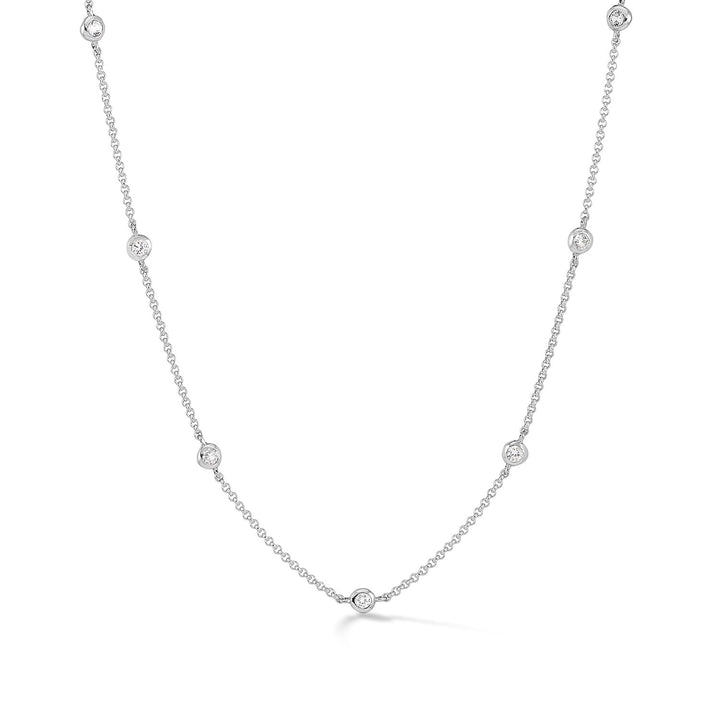 This White Sapphire Dewdrop Chain Necklace by Dower & Hall exudes elegance with its 9 sparkling white sapphires, each encased in round settings along a delicate sterling silver chain. The necklace is completed with a signature lobster catch (or quatrefoil catch in yellow gold vermeil). Its subtle yet radiant beauty makes it the perfect piece to elevate any outfit.
