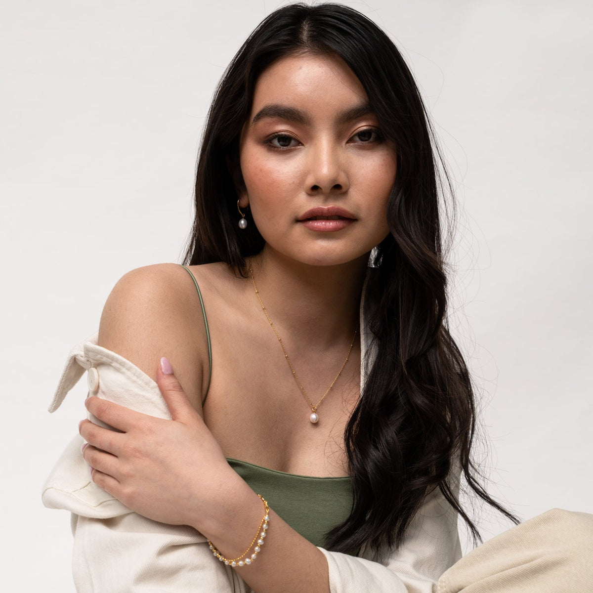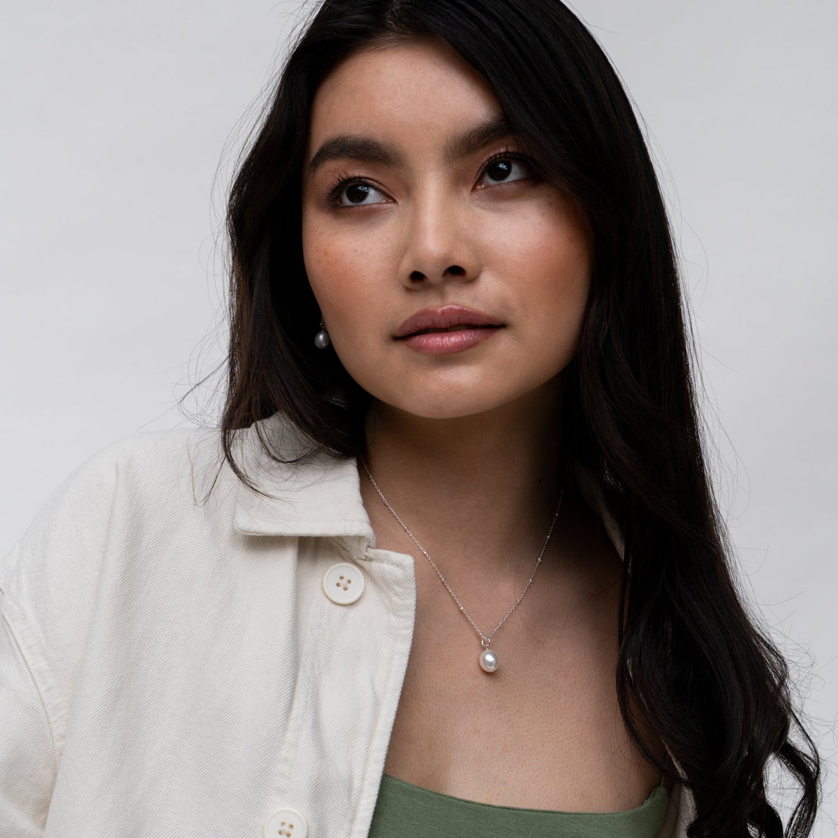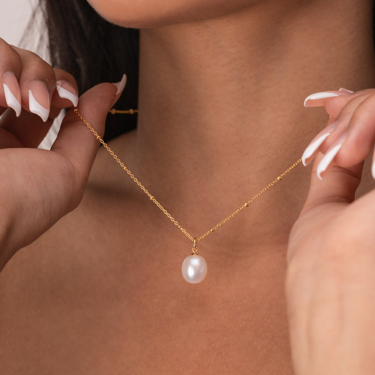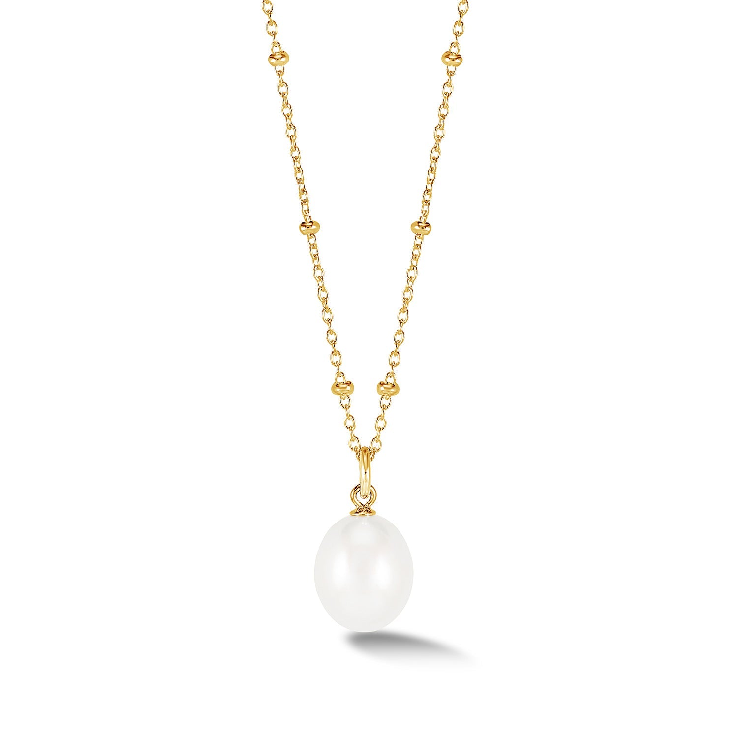 This Timeless Adjustable 10mm Oval White Freshwater Pearl Pendant by Dower & Hall features a lustrous oval white pearl suspended on a contemporary sterling silver beaded chain. The chain length is adjustable, allowing you to wear this piece solo or layered with other necklaces. Available in sterling silver or with a radiant 18ct yellow gold vermeil finish.