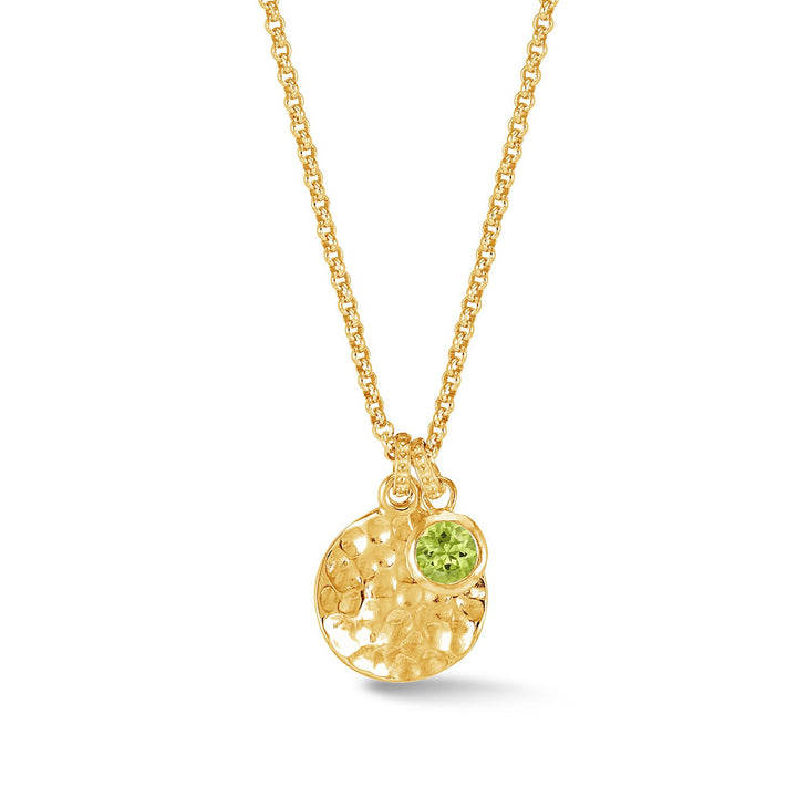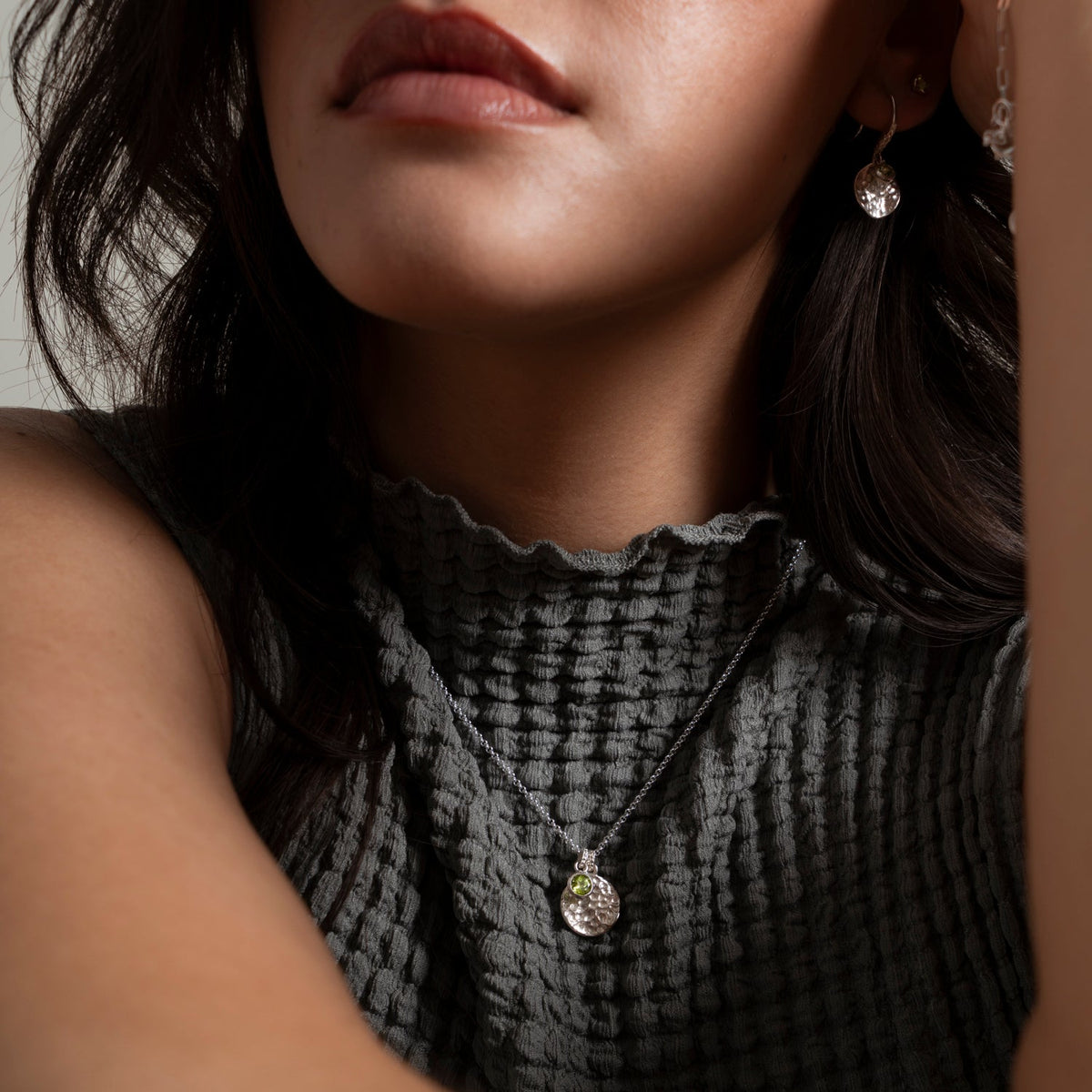 Handcrafted in sterling silver with a 5mm peridot gemstone. The disc measures 14mm. Suspended on fine chain, complete with a signature quatrefoil lobster catch. Available in sterling silver or 18ct yellow gold vermeil finish.