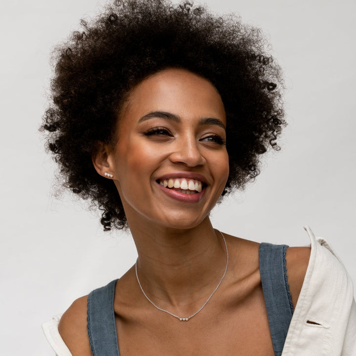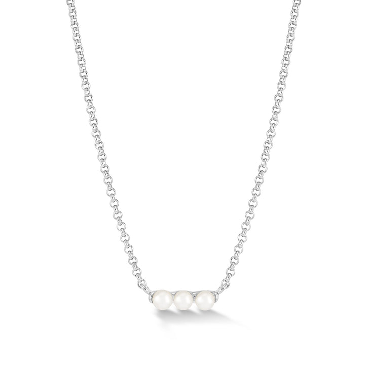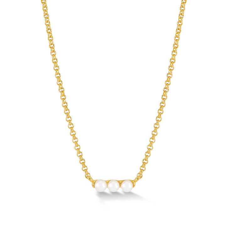 This Timeless Triple Pearl Row Pendant by Dower & Hall features three white freshwater pearls set in a horizontal bar, creating a delicate and timeless design. Available in both sterling silver and yellow gold vermeil finishes, this pendant is a must-have in your jewelry collection.