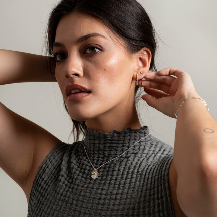 Available in sterling silver or 18ct yellow gold vermeil. Featuring 4mm peridot gemstones set in a four-claw signature lotus design with post and butterfly back.