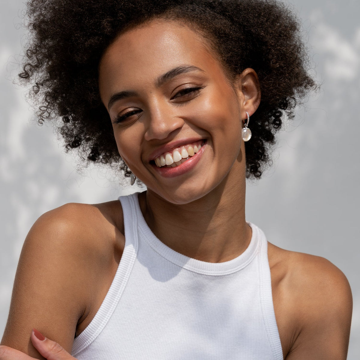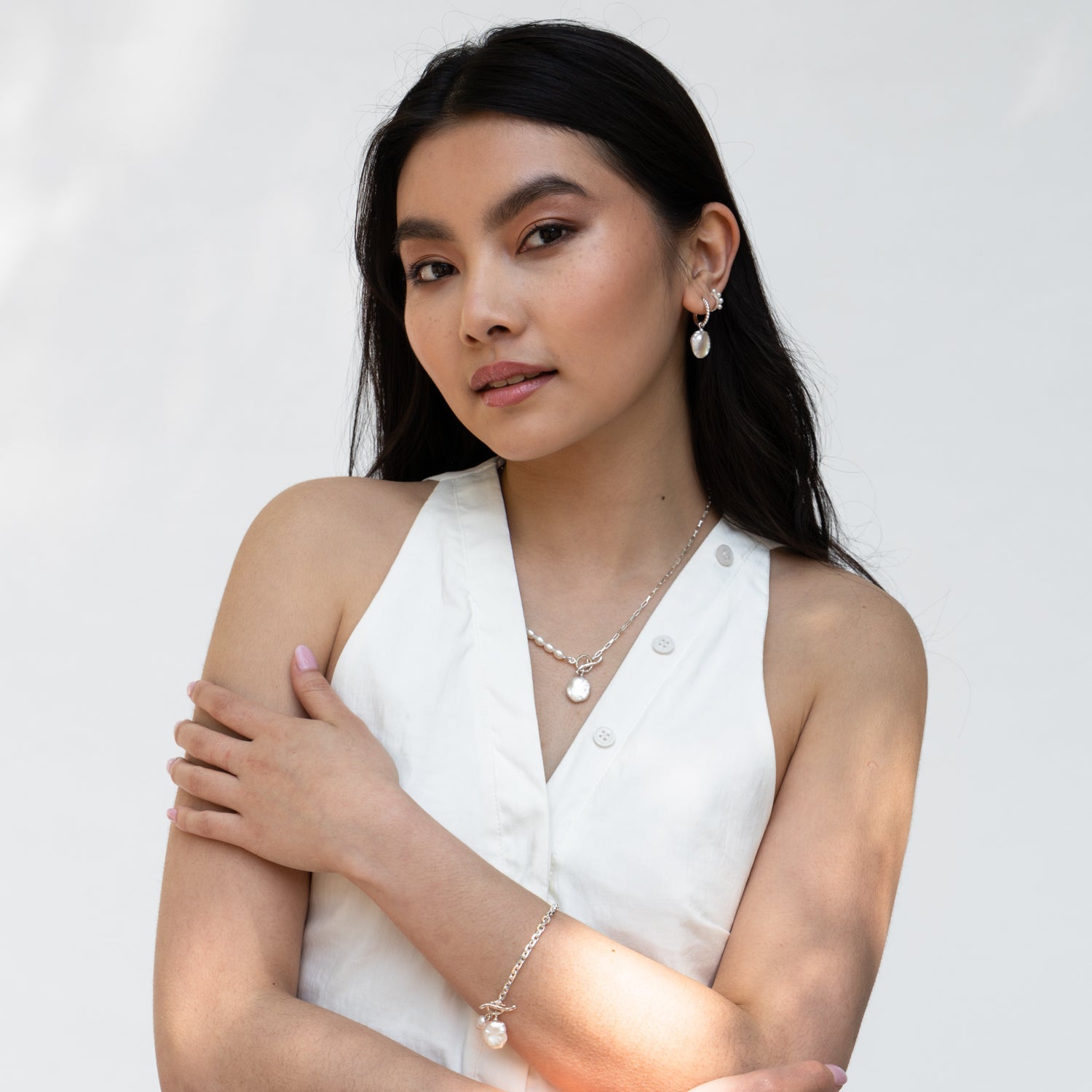 These Timeless Keshi Pearl Hoops by Dower & Hall from the Luna Pearls Collection combine organic elegance with contemporary design. The lustrous white keshi pearl charm drop is complemented by the signature dotty texture on the sterling silver hinged huggie hoops. Keshi pearls are freeform in shape, making each piece truly one of a kind.
