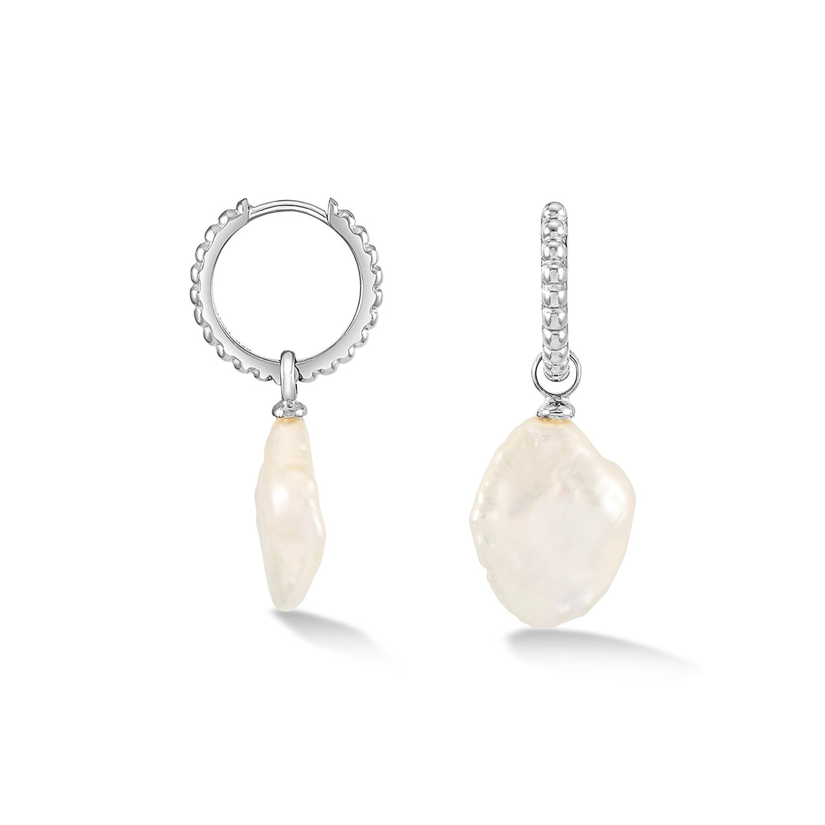 Handcrafted in sterling silver with a 12mm white keshi pearl charm. Hoop size: 15mm. Available in sterling silver or 18ct yellow gold vermeil finish.