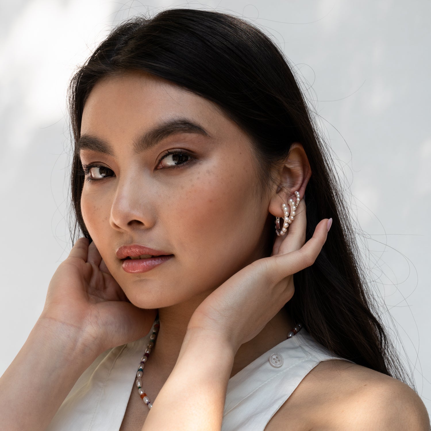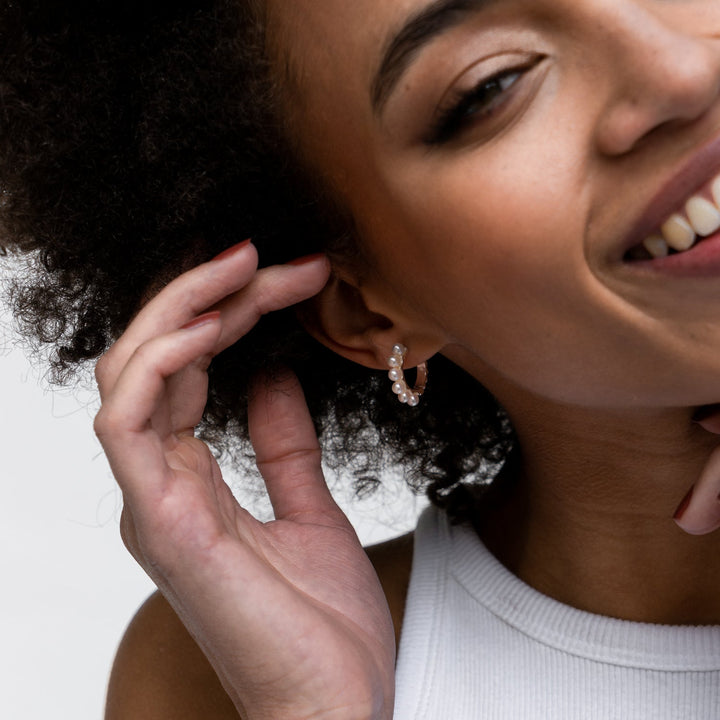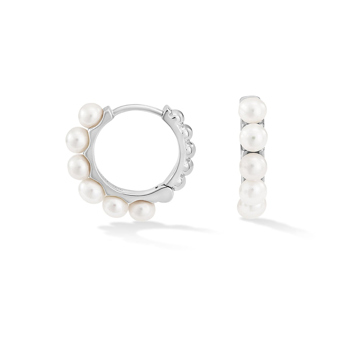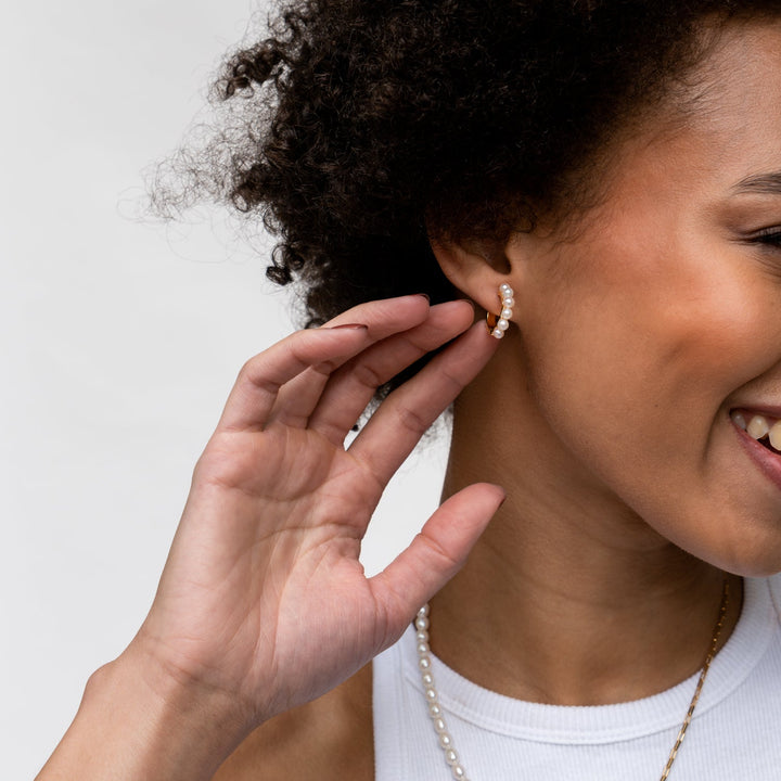 Handcrafted in sterling silver with 18ct yellow gold vermeil finish, featuring white freshwater pearls measuring 3.5mm. Hoop size: 15mm.