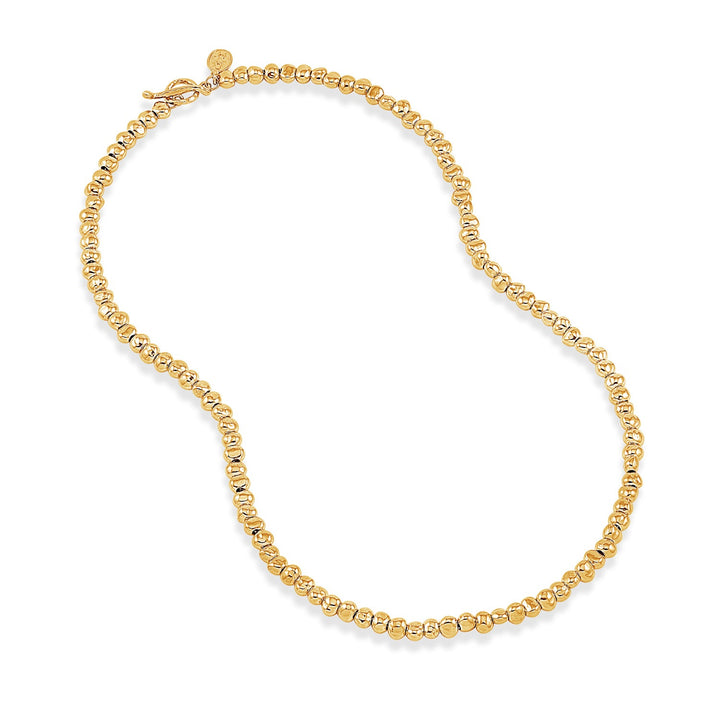 This Chunky Signature Nugget Necklace by Dower & Hall is a bold and timeless piece, made of medium beaten nugget-shaped beads threaded onto a chain. The necklace is finished with a signature hammered circle and t-bar clasp, creating a classic, sophisticated look. Whether worn alone or layered with other pieces, it adds a touch of elegance to any outfit.