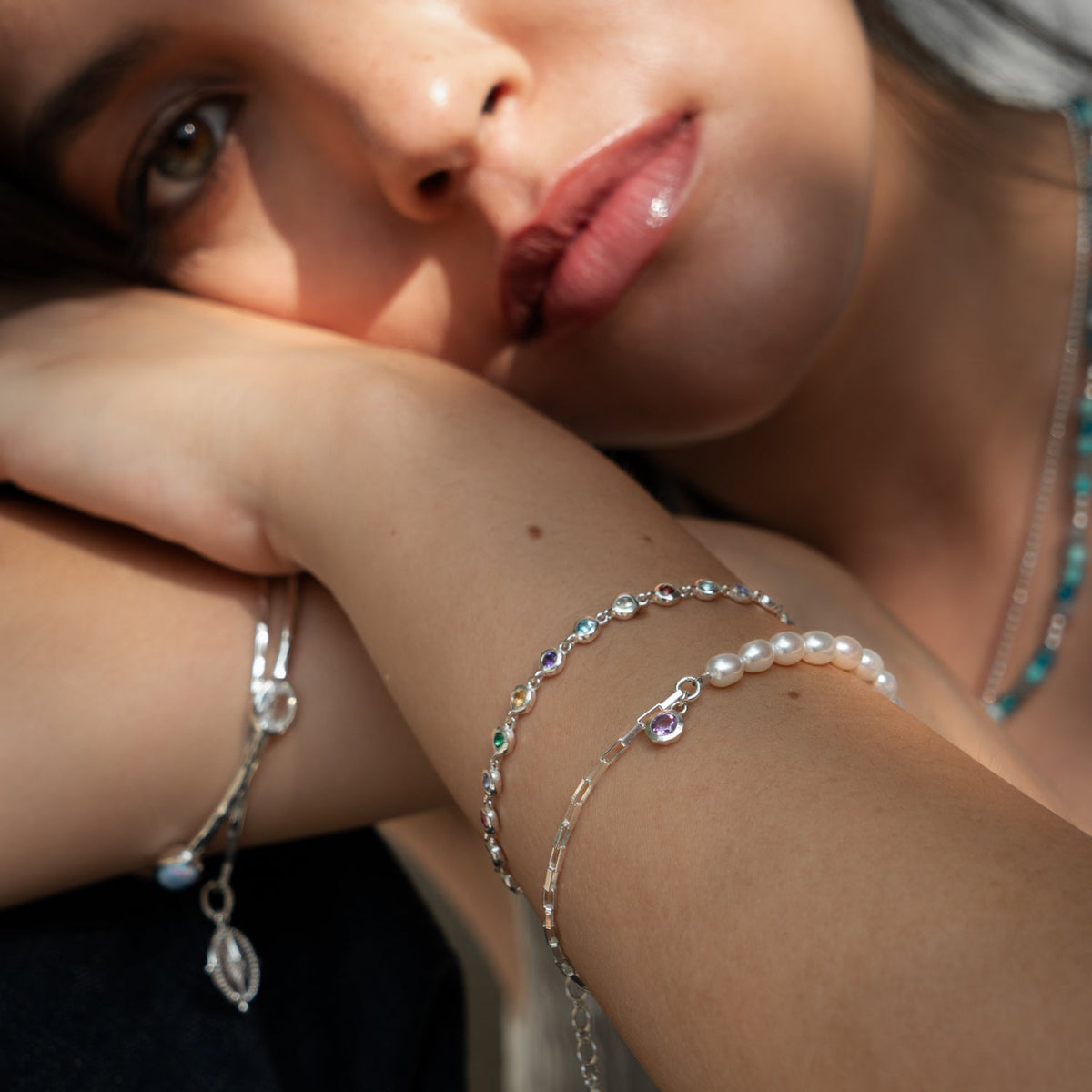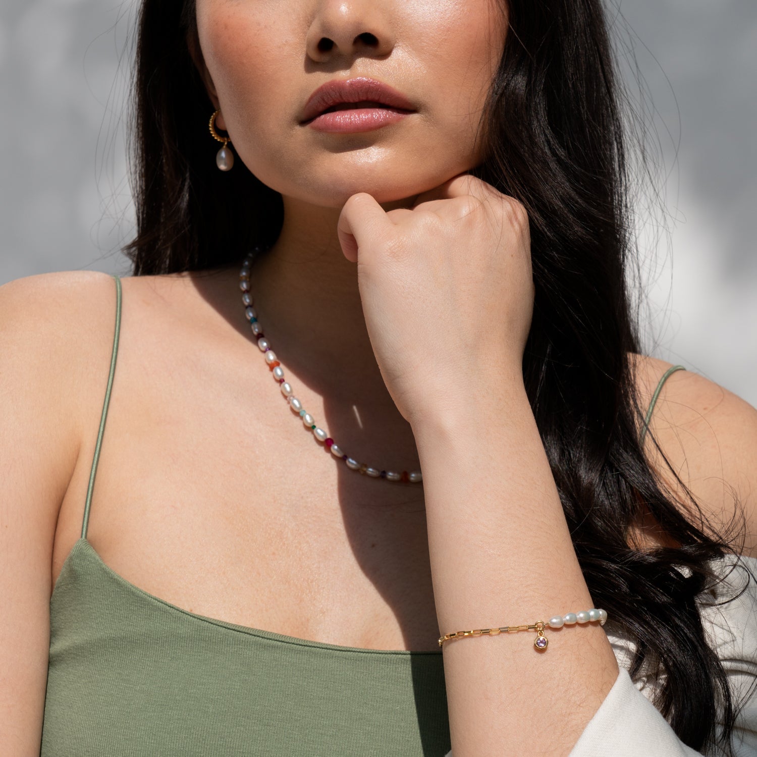 Luna White Pearl, Chain and Amethyst Drop Bracelet