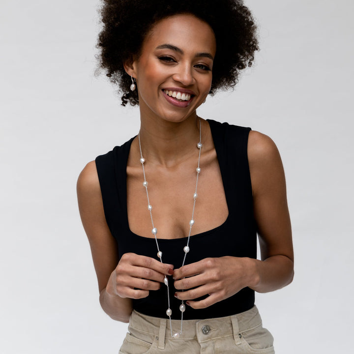 This Long White Baroque Pearl Chain Necklace by Dower & Hall is a stunning statement piece, featuring large, lustrous white baroque freshwater pearls suspended on fine chain. Known for their irregular, one-of-a-kind shape, the 40-inch necklace is finished with an 18ct yellow gold vermeil or sterling silver finish, complemented by our signature hammered loop and t-bar clasp.
