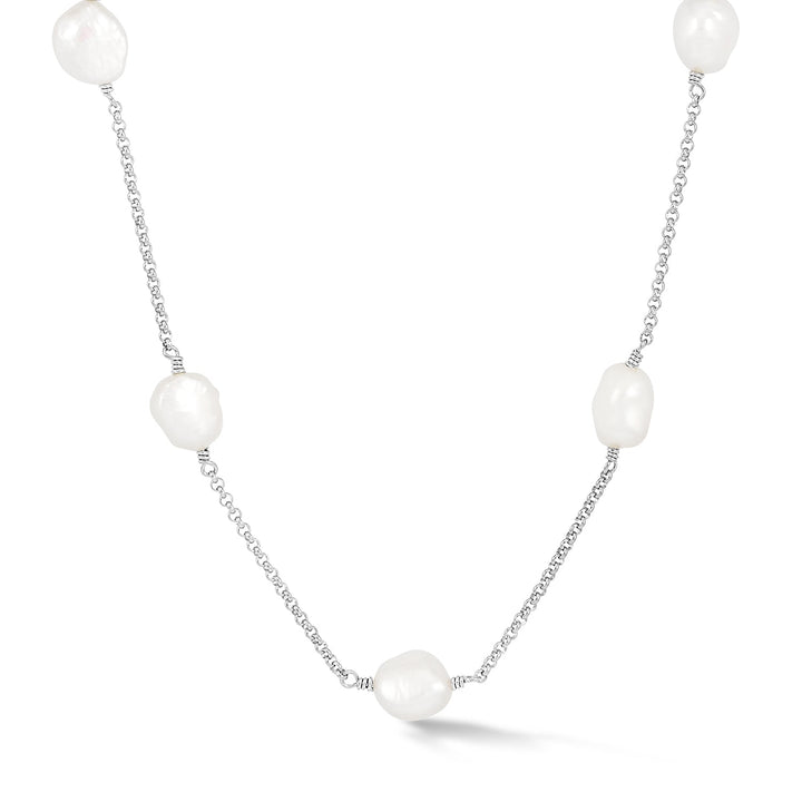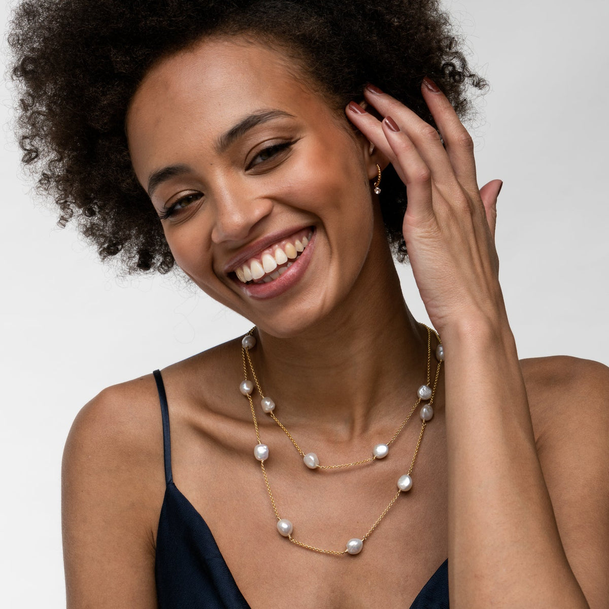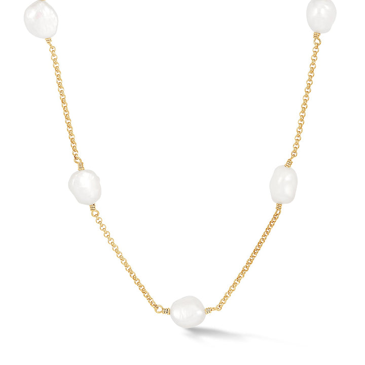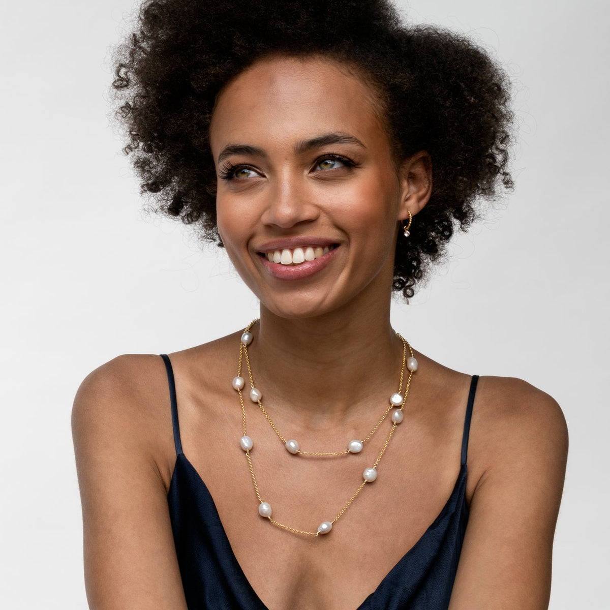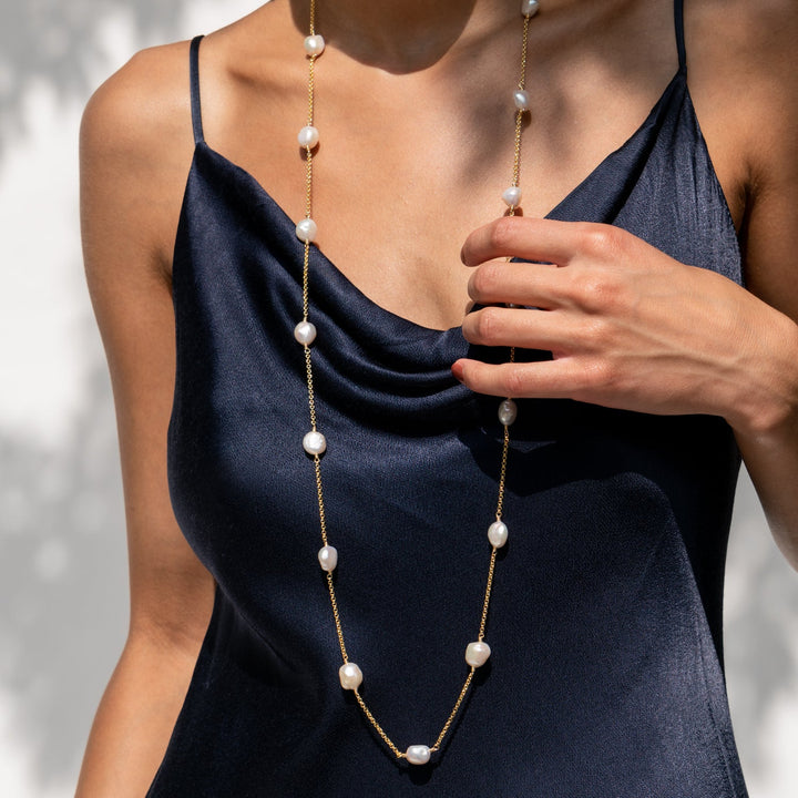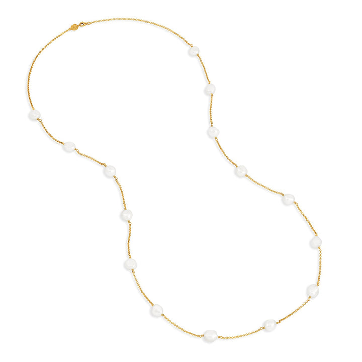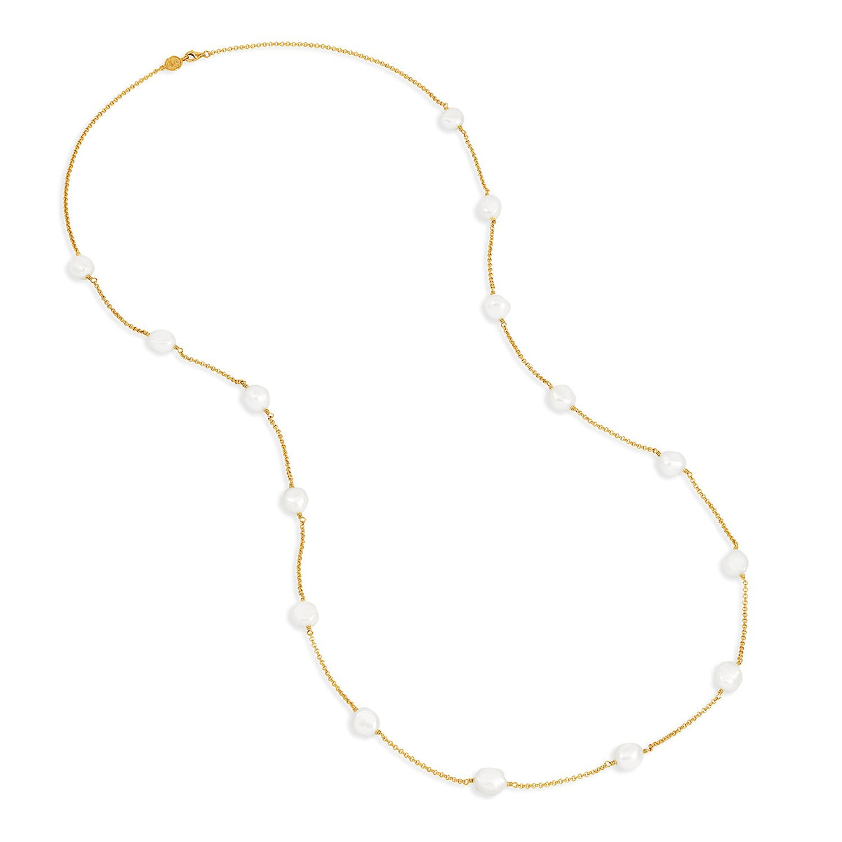 Handcrafted in sterling silver or with 18ct yellow gold vermeil finish. White baroque freshwater pearls (10 x 14mm). Necklace length: 40 inches.
